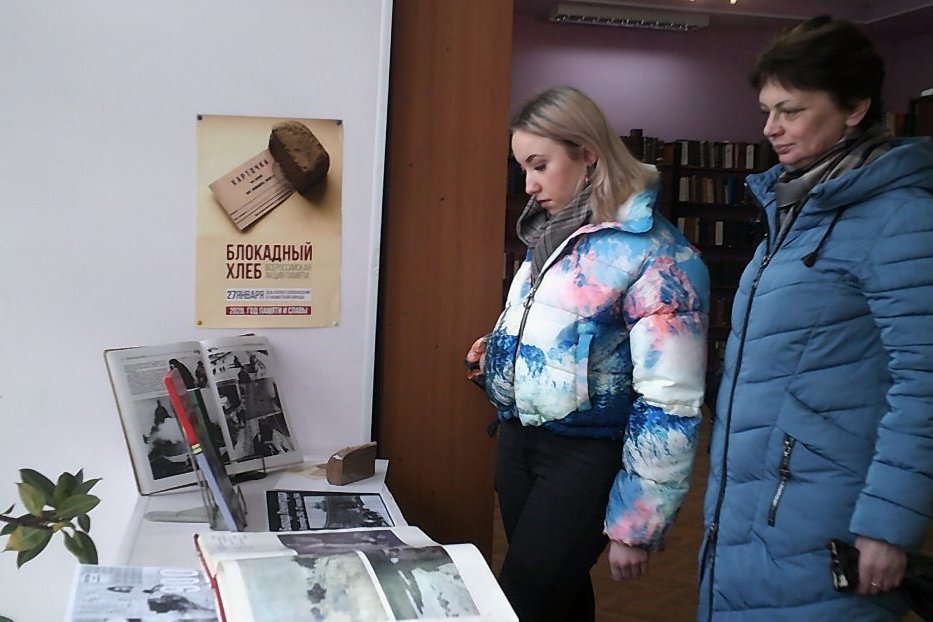 Посетители библиотеки смогли познакомиться с выставкой «Блокадный хлеб», на которой были представлены фотографии, запечатлевшие реалии блокады, книги воспоминаний переживших блокаду, а для юных читателей представлена книга С. Алексеева «Подвиг Ленинграда».