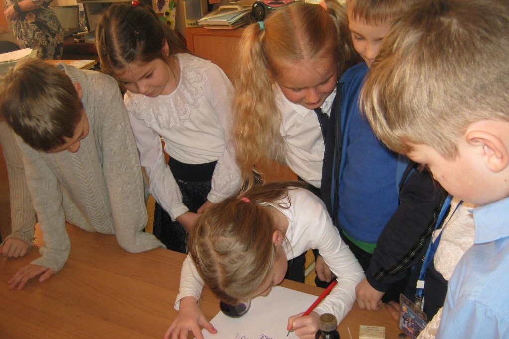 Ребята узнали еще и о том, что раньше до появления ручек со стержнем, писали перьевой ручкой и чернилами. А наш любимый поэт А. Пушкин, все свои сказки и стихи писал пером, настоящим гусиным пером, да и не только он, даже царские особы и те писали перьями птиц страуса, павлина.