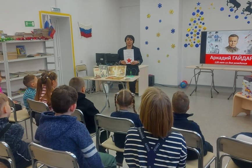 В библиотеке № 2 в программе «Писатели-юбиляры», прошел час знания для ребят школы продленного дня «Эрудит». Школьники познакомились с жизнью и творчеством замечательного детского писателя, который прожил не долгую, но яркую жизнь. Дети с интересом прослушали рассказ «Совесть», и все вместе обсудили поступок девочки Нины. Ребятам рассказали о самой известной повести Гайдара «Тимур и его команда». Ведь история создания взята из жизни писателя, когда он посоветовал мальчишкам-хулиганам играть в «хороших людей» и помогать всем нуждающимся в то нелегкое время. Так появилось первое «Тимуровское» волонтерское движение, которое было описано в книге «Тимур и его команда». В заключении мероприятия ребята рассмотрели выставку книг Аркадия Петровича Гайдара, которые полны приключений и вдохновляют детей на смелость и дружбу.