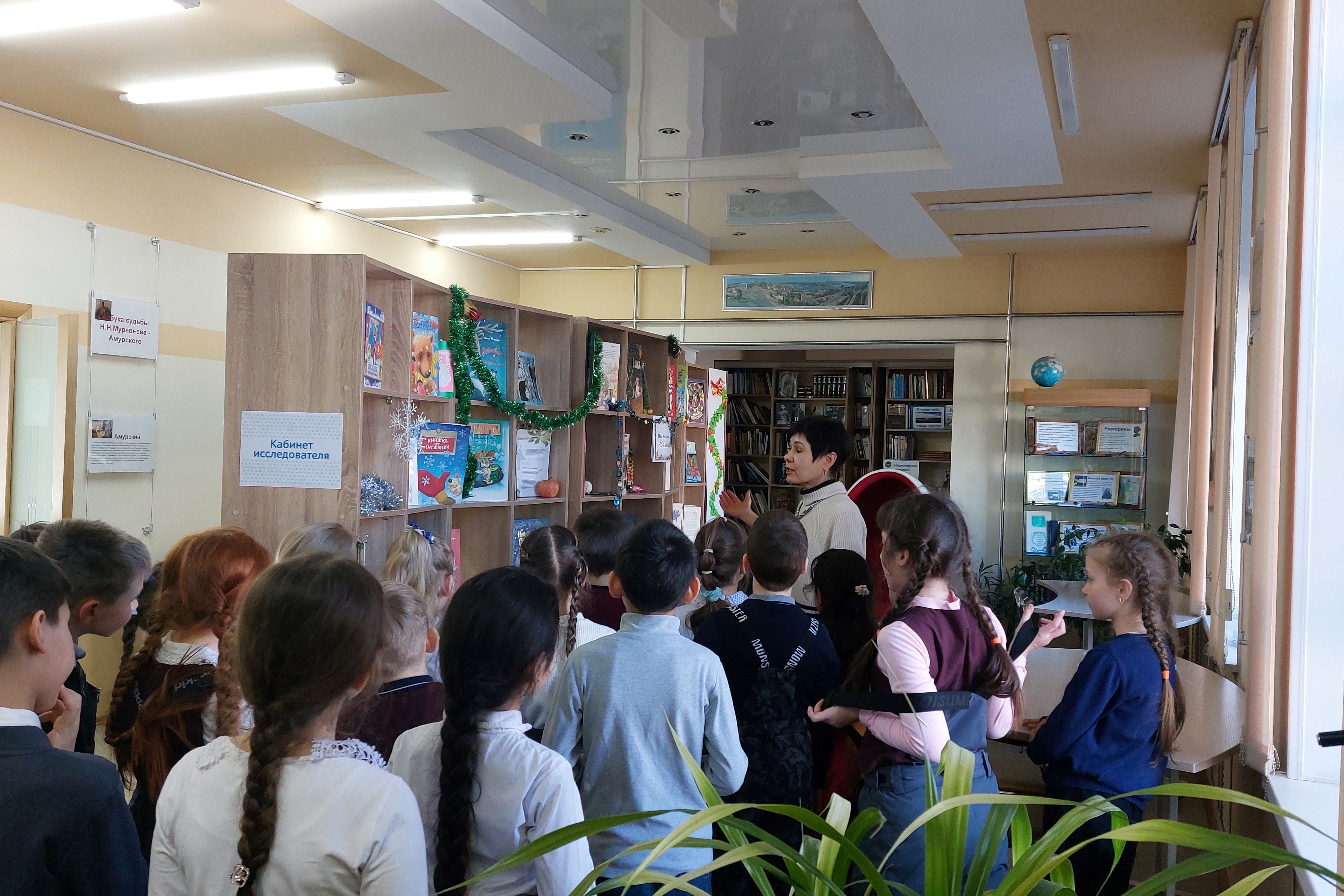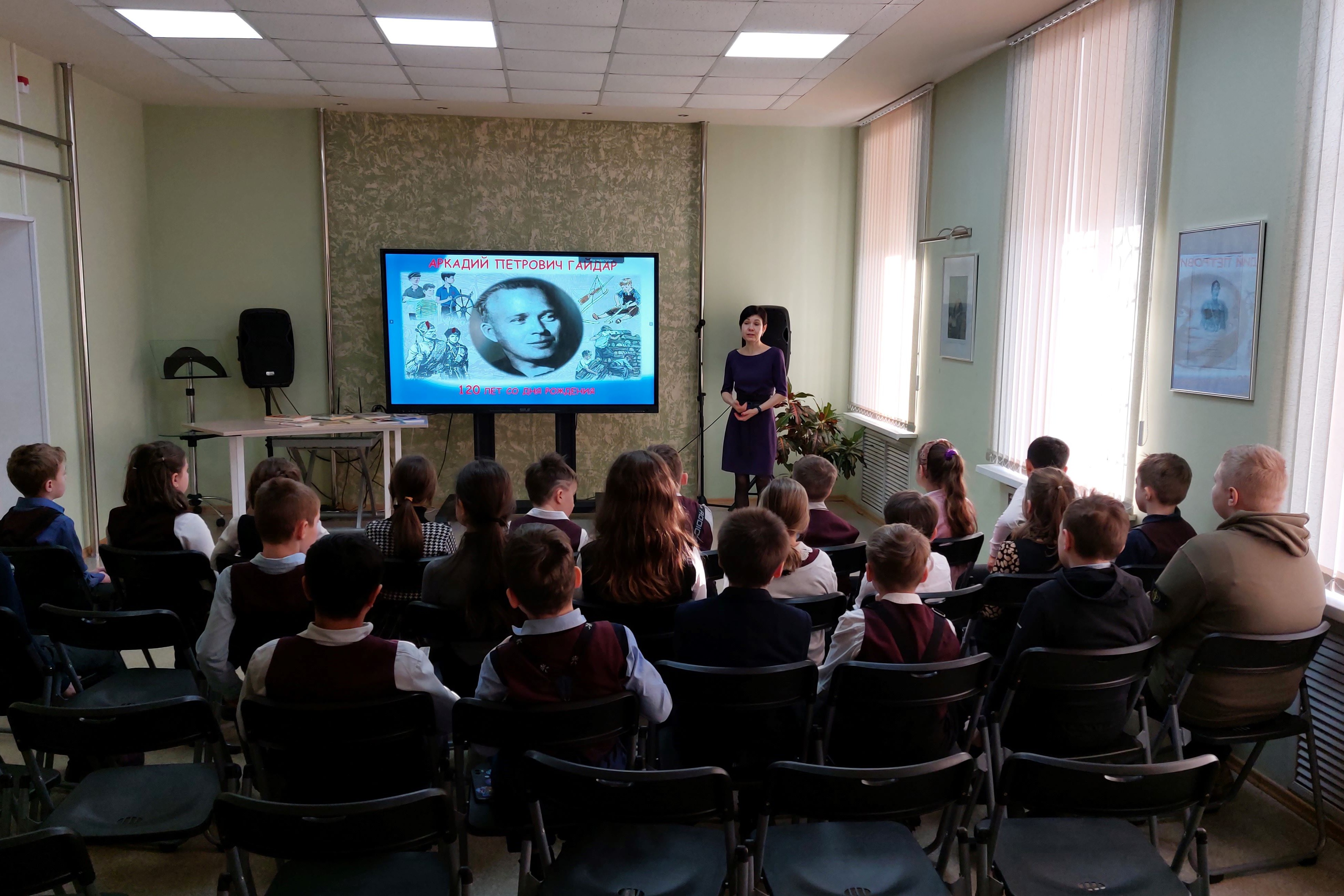 Литературное путешествие «По страницам зачитанных книжек» для школьников СОШ № 62 состоялось в библиотеке им. Н.Н. Муравьева-Амурского. Мероприятия о жизни и творчестве писателя сопровождалось просмотром электронной презентации, а также чтением вслух произведений Гайдара. Живой интерес у ребят вызвало знакомство с необычной биографией писателя, его боевой юности, многочисленных путешествиях по стране, познакомились с музеями и памятниками, посвященными писателю. В рамках школьной программы ребята знакомы с рассказом «Чук и Гек» и некоторые уже познакомились с новым художественным фильмом, снятом по одноименному произведению. Интересным моментом мероприятия стало чтение вслух и обсуждение «Сказки о военной тайне» и сказки «Горячий камень», сюжет которой нашел отклик в сердцах юных читателей. Ребята высказались о том, как они понимают патриотизм, порядочность, счастье, честная жизнь. Юные читатели познакомились с такими понятиями как «пионер», «тимуровское движение», появившееся в нашей стране после выхода в свет повести «Тимур и его команда» и ставшее прообразом волонтерства, задавали уточняющие вопросы. Творчество Аркадия Гайдара понятно и сегодняшнему поколению школьников, его произведения вызывают интерес у юных читателей.