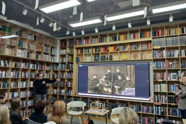Гости увидели уникальные материалы из личного архива лектора — фото и документы экспедиции по партизанским тропам Фадеева и местам его жизни в послевоенные годы.