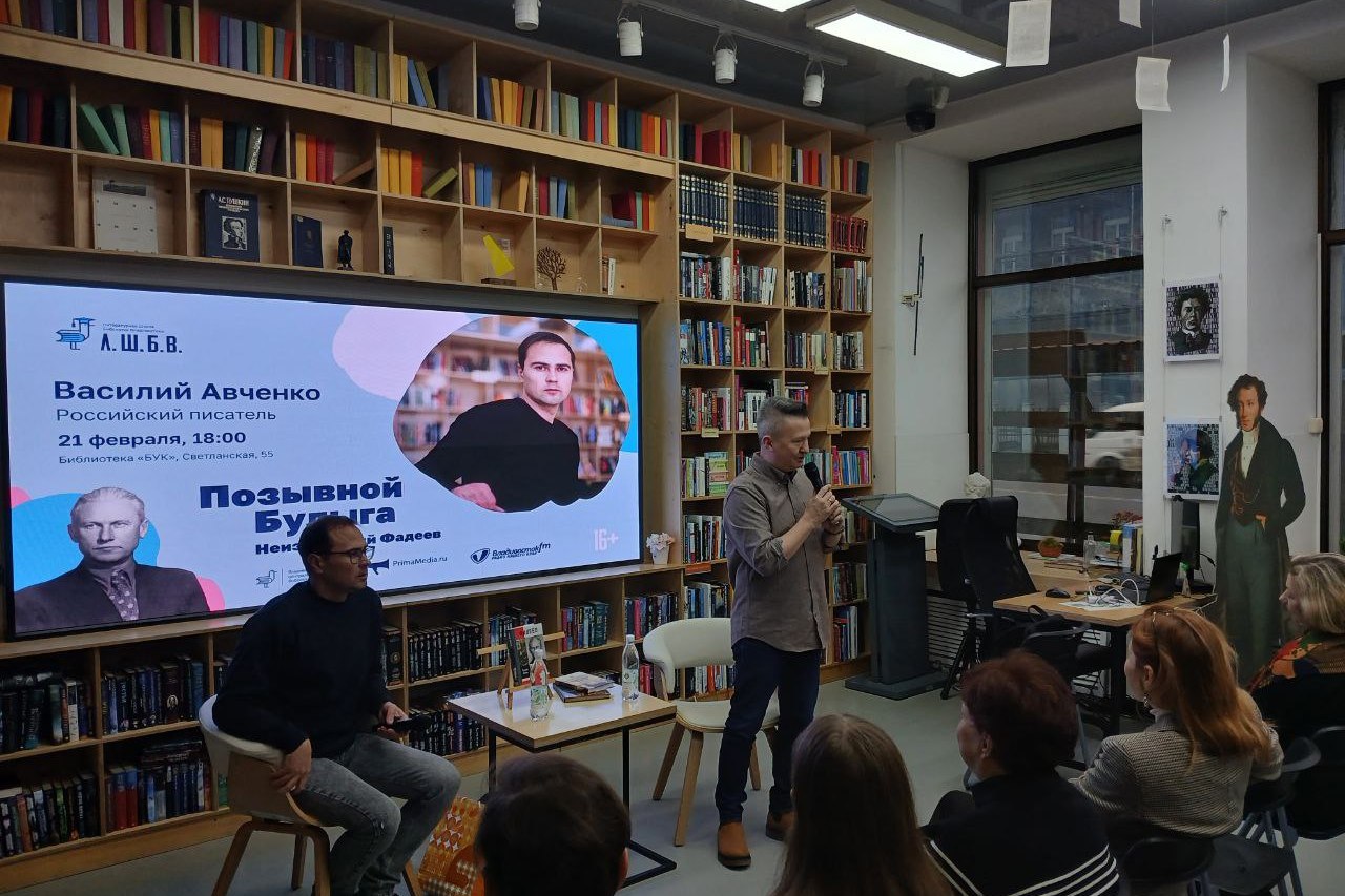 21 февраля в рамках проекта «Литературная школа библиотек Владивостока» состоялась лекция «Позывной Булыга. Неизвестный Фадеев». Лектором стал известный российский писатель, журналист и автор книги «Фадеев» — Василий Авченко. Лекция прошла в формате открытого диалога, который поддерживал директор Владивостокской централизованной библиотечной системы Сергей Соловьев.