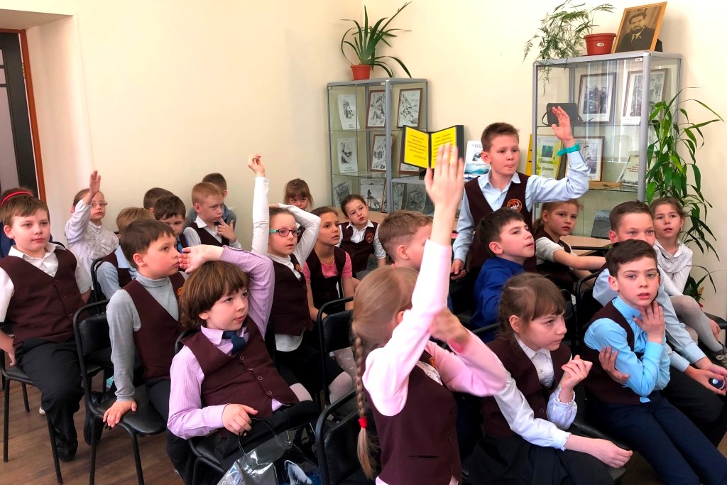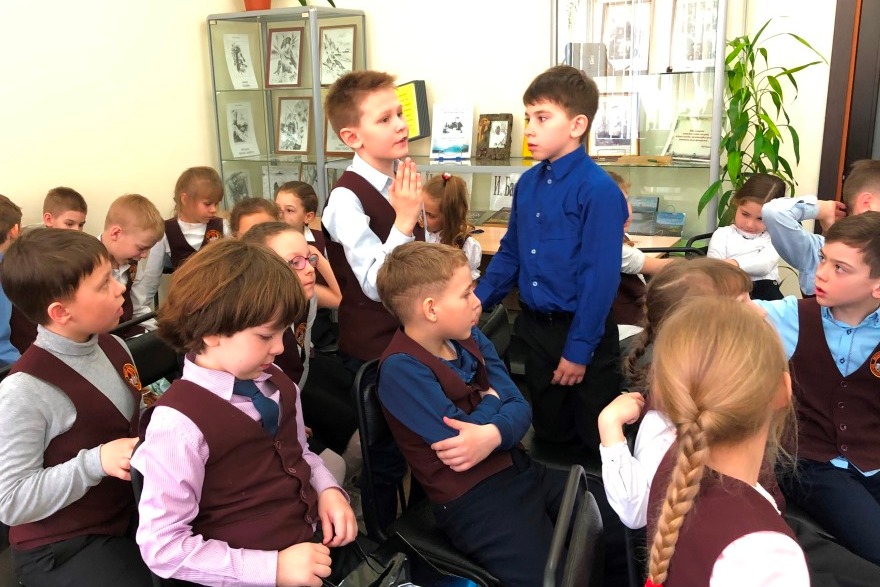 Во время обзора выставки ранних произведений Ивана Басаргина ребята называли знакомые им книги: «Кот- ворюга», «Прощай, Мишка!», «Диверсанты».