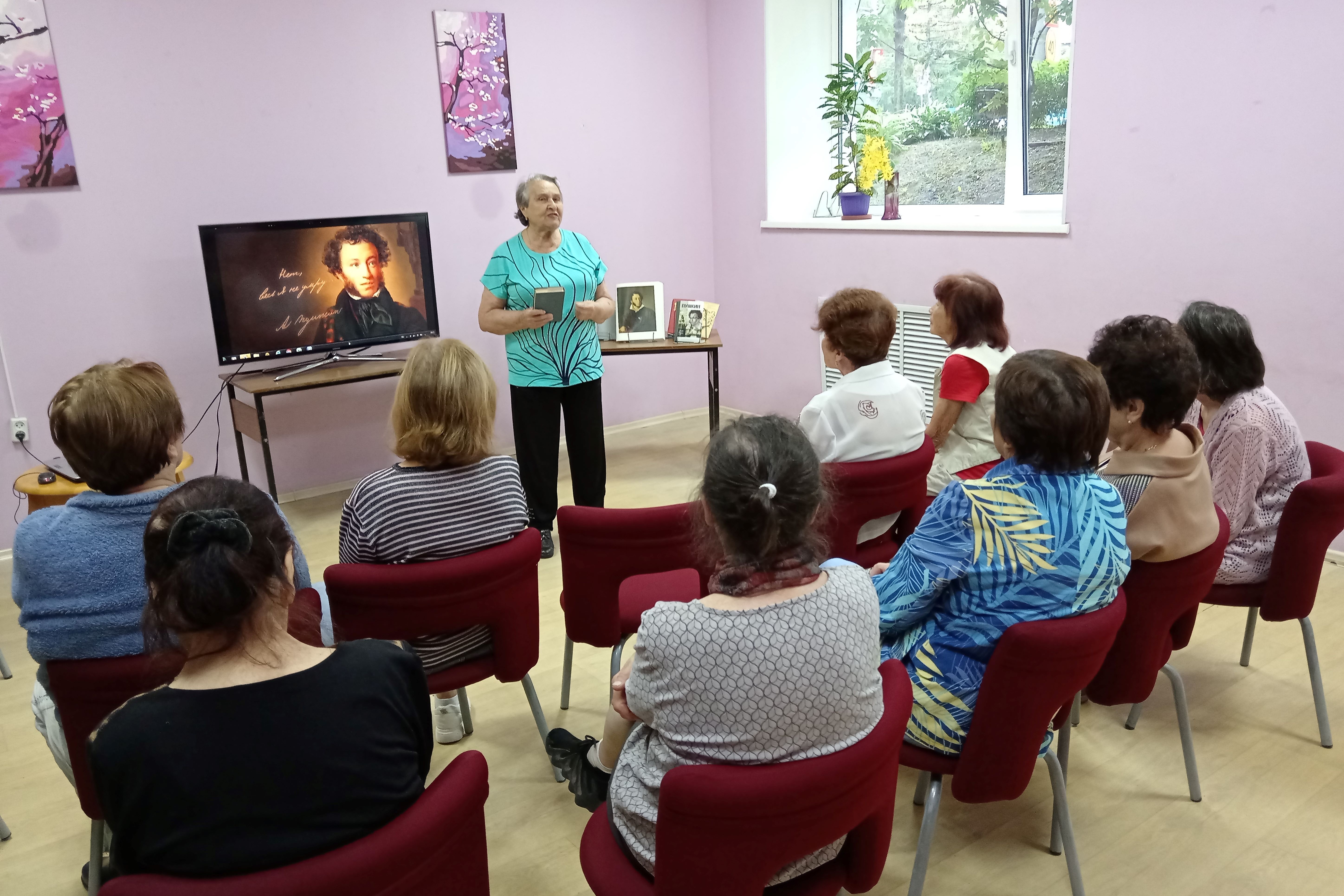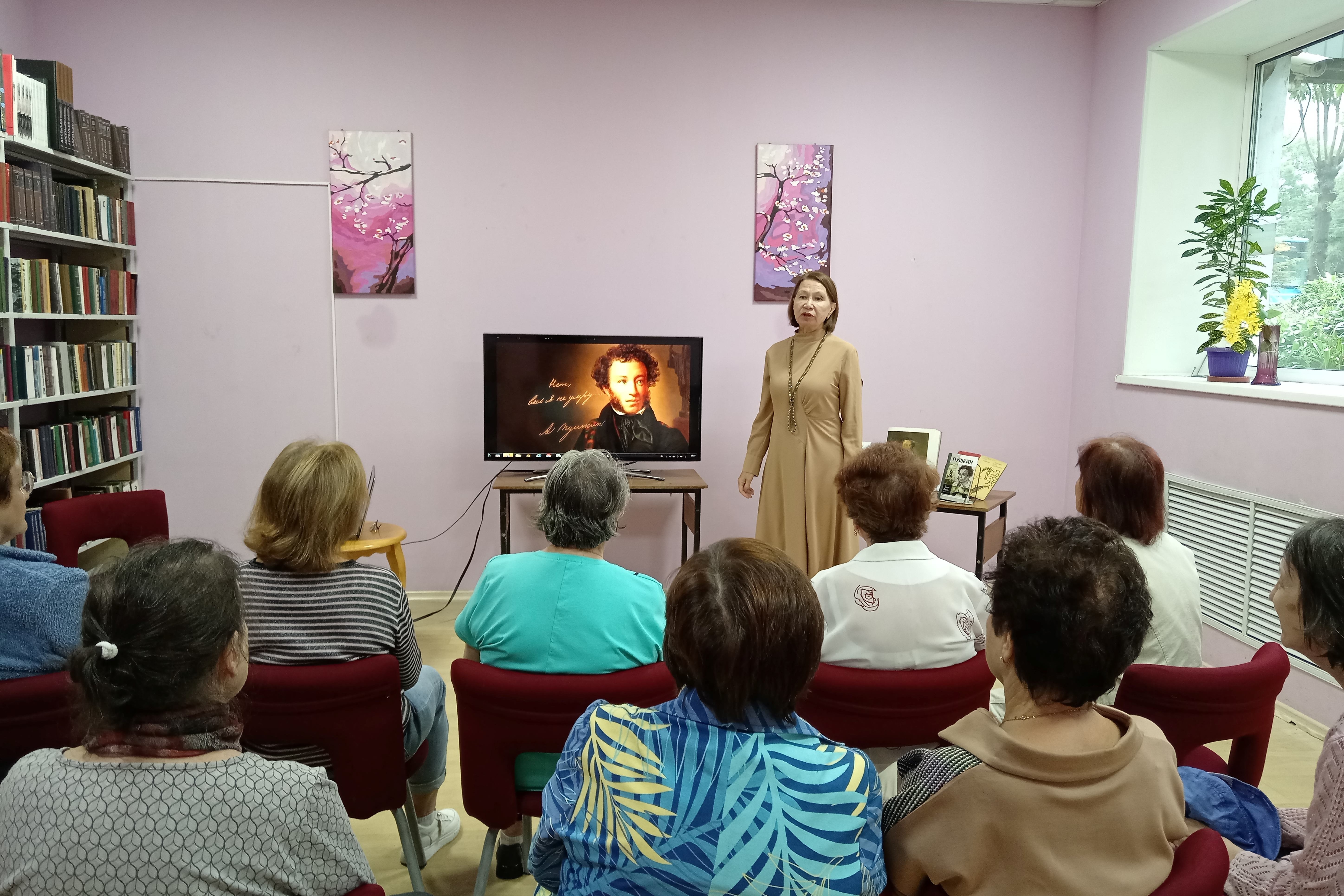 Участница клуба Нина Андреевна Сутурина рассказала об общем колорите поэзии А.С. Пушкина и почему именно он стал началом начал великой русской литературы ХIХ столетия. Рассказ о Пушкине сопровождался чтением стихов: «Осеннее утро», «Я вас любил», «Признание», «Зачем я ею очарован»», «Сожженное письмо», «Талисман» которые читали участники клуба. Также звучала классическая музыка, романсы: «В крови горит огонь желанья», «Зимняя дорога», «Я помню чудное мгновенье». Член клубного объединения Людмила Соболева прочитала стихотворение «Простишь ли мне ревнивые мечты» и исполнила романс «Фонтан любви», который вызвал благодарность и бурные аплодисменты зрителей. Атмосфера вечера была удивительно творческой, теплой и нашла отклик в душе каждого участника клуба.