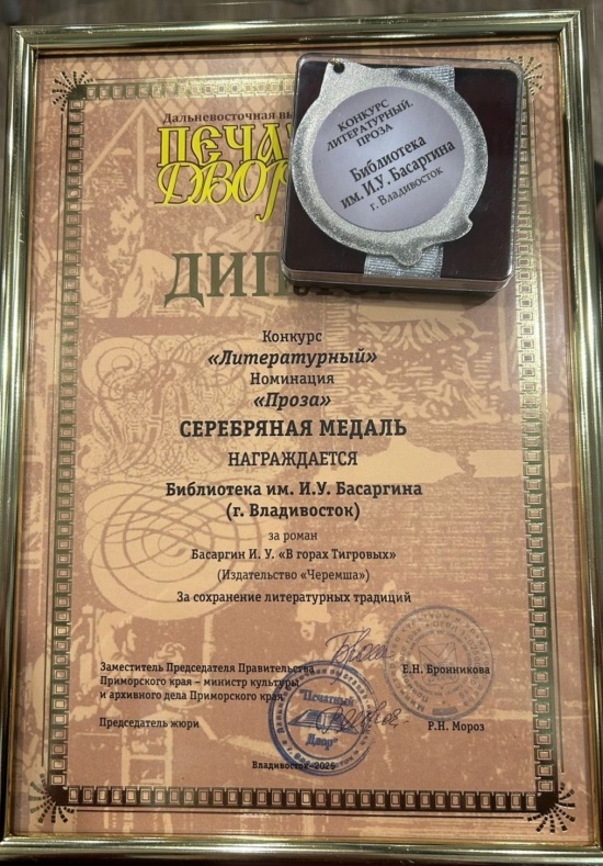 Среди награжденных – библиотека им. И.У. Басаргина (г. Владивосток) за роман «В горах Тигровых», который был удостоен высокой награды в конкурсе «Литературный» в номинации – «Проза». Библиотека получила «Серебряную медаль» и Диплом за сохранение литературных традиций.