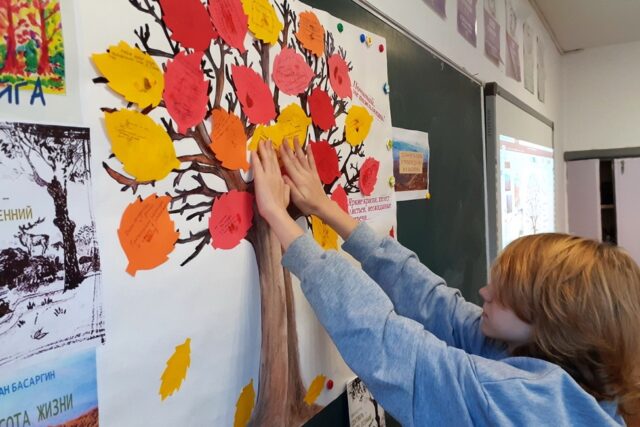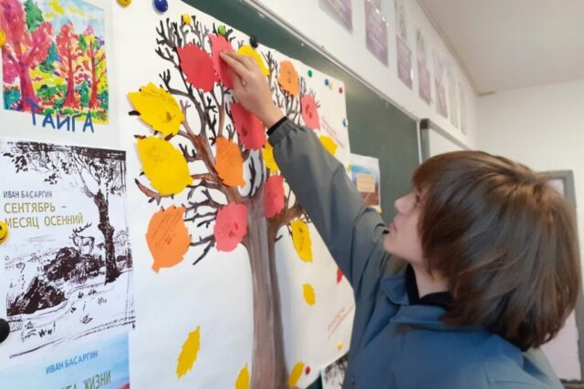На цветных листиках ребята записали свои пожелания и мнения о прочитанном, отметили, что автор красочно и ярко изобразил приморскую осень, советовали прочитать наиболее понравившуюся книгу и привели цитаты из них, а затем прикрепили стикеры на ветки дерева. Постепенно дерево «обросло» листьями и оно «вспыхнуло» яркими красками.