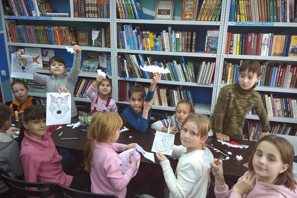На последнем занятии этого года на творческой мастерской в библиотеке №17 дети готовили новогоднюю атрибутику для окон. Каждый из 18 пришедших детей получил индивидуальное задание: старшие дети вырезали сложные узоры уголков и колокольчиков из отпечатанных заранее трафаретов, младшие дети вырезали мышат, ёлочки и прочие вытыканки из бумаги, разрисовывали карнавальные маски. Каждому нашлось интересное и полезное занятие.