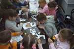 На последнем занятии этого года на творческой мастерской в библиотеке №17 дети готовили новогоднюю атрибутику для окон. Каждый из 18 пришедших детей получил индивидуальное задание: старшие дети вырезали сложные узоры уголков и колокольчиков из отпечатанных заранее трафаретов, младшие дети вырезали мышат, ёлочки и прочие вытыканки из бумаги, разрисовывали карнавальные маски. Каждому нашлось интересное и полезное занятие.