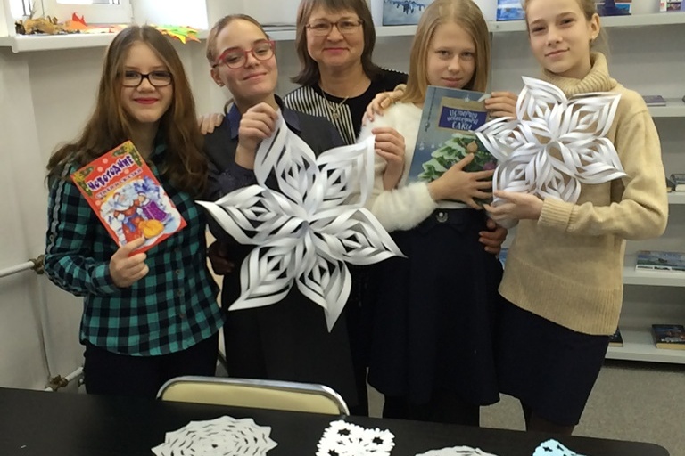 Затем приступили к вырезанию эксклюзивных снежинок. Затруднение у многих вызвал сам процесс складывания листа для вырезания снежинки. Но в результате, каждый ребёнок вырезал по две снежинки – одну для украшения библиотеки, вторую – для дома. Фоном для создания предпраздничного настроения детей служили сопровождавшие мероприятие весёлые детские аудио песни.