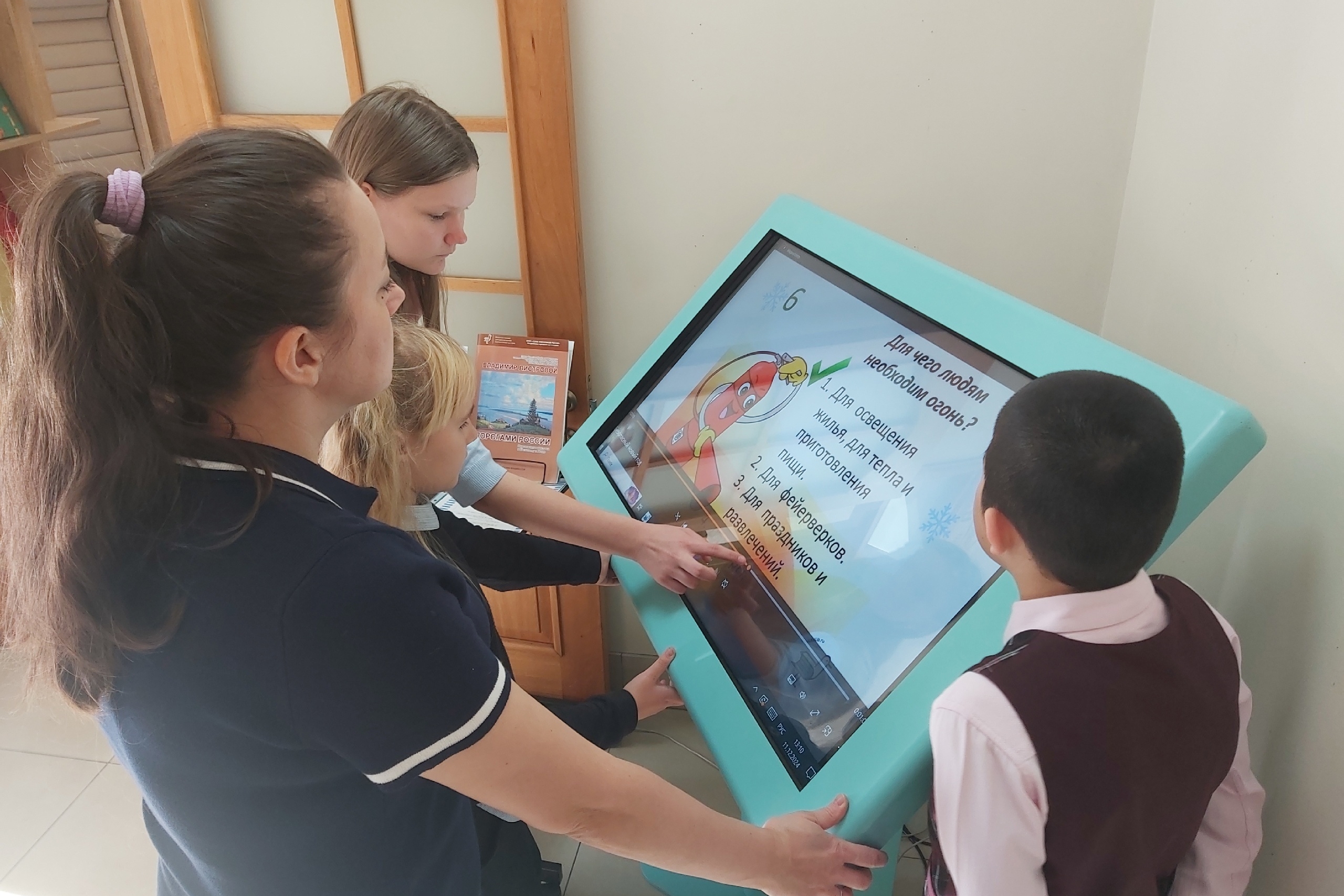 Школьники решили загадки и викторину по теме безопасности в новогодние праздники, чтобы закрепить полученные знания и убедиться, что все прекрасно знают, как правильно действовать в определённых ситуациях. Также в течение недели на интерактивном столе в фойе библиотеки каждый желающий ребёнок, один или вместе с родителями мог пройти квиз «Искру тушим до пожара» по правилам пожарной безопасности на новогодних каникулах.