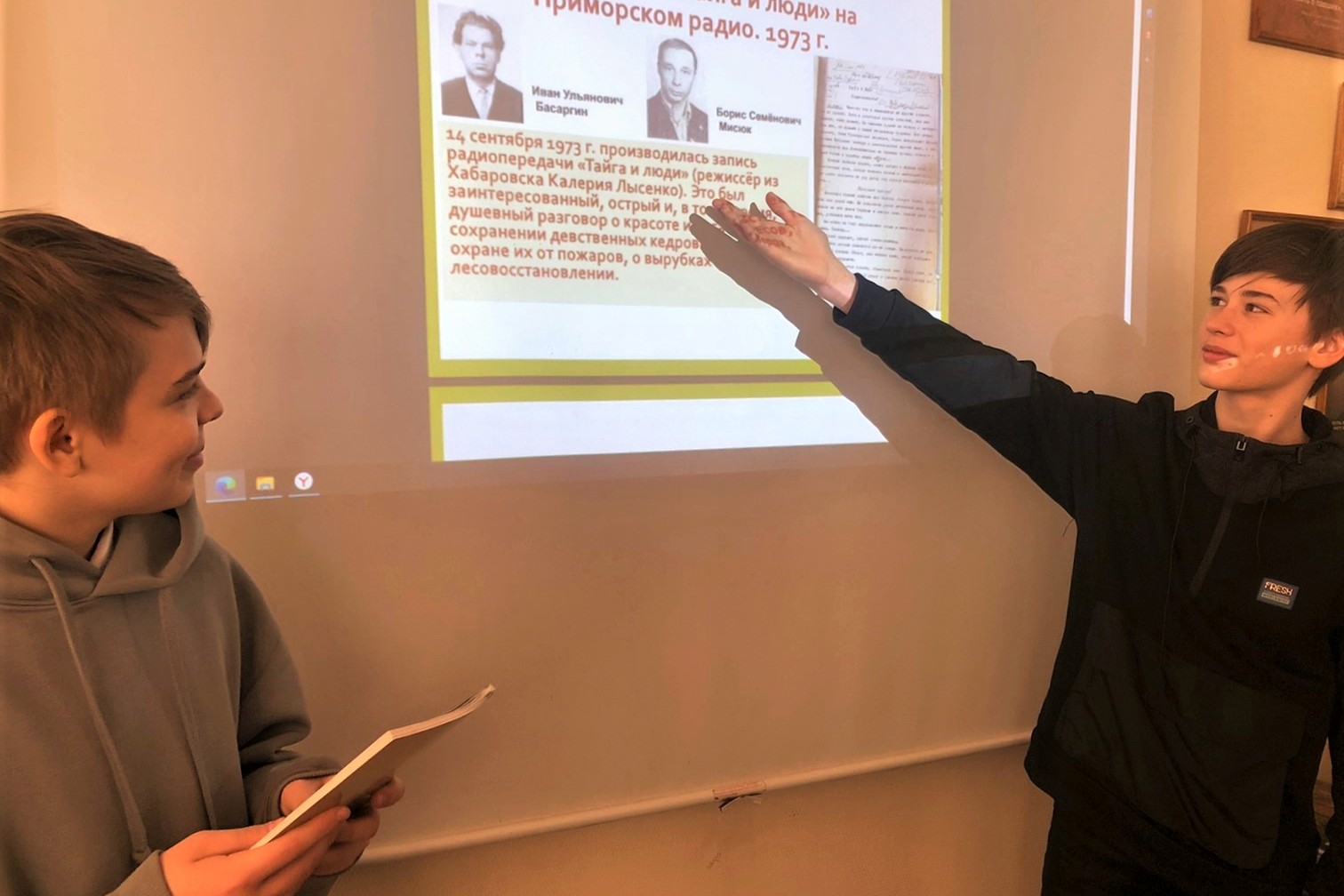 Далее, в ходе просмотра презентации, школьники познакомились с новой для них гранью творчества И.У. Басаргина. Ещё в середине 1960-х годов Иван Ульянович многократно встречался с лесозаготовителями и лесниками разных районов края, выступал с лекциями об охране природы перед тружениками Кавалеровского района, где он тогда проживал, писал статьи и очерки о необходимости сохранения тайги в районную газету, в журнал «Природа», ведь оружие писателя – слово. 14 сентября 1973 г. на Приморском радио была сделана запись радиопередачи «Тайга и люди» (режиссёр из Хабаровска Калерия Фёдоровна Лысенко). Это был заинтересованный, острый и, в то же время, душевный разговор о красоте и богатстве тайги, сохранении девственных кедровых лесов, охране их от пожаров, о вырубках кедра, лесовосстановлении. Материалы для передачи были подготовлены И.У. Басаргиным и Б.С. Мисюком, которые побывали в нескольких леспромхозах, беседовали с лесозаготовителями, лесничими, руководителями лесхозов. Участие в радиопередаче И.У. Басаргина, звучащие в актерском исполнении отрывки из его произведений усиливали эмоциональное воздействие на слушателей; включение фрагментов беседы с директором Арсеньевского лесхоза Б.А. Данцером, технологом одного из Арсеньевских леспромхозов В.М. Товпенко, лесничим Чернышевского лесничества В.О. Ткаченко и др. увеличивало доверие слушателей к материалу.