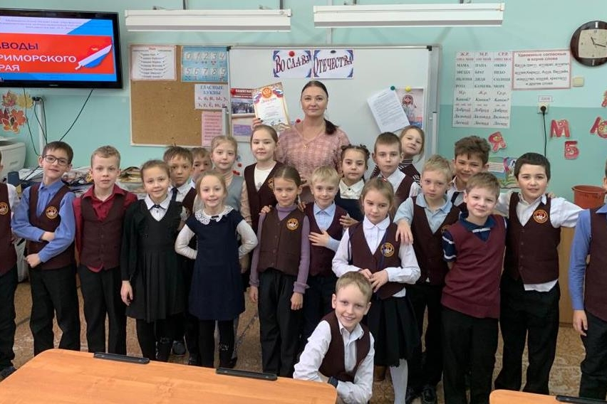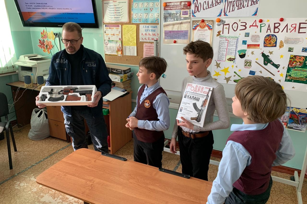 В канун празднования 23 февраля состоялась встреча с ребятами 2-х и 4-х классов МБОУ «СОШ № 57». В программе мероприятия – электронная презентация «Герои российского тыла» о страницах истории заводов Приморского края, их наградах, боевых заслугах и ратной деятельности во славу нашего Отечества и защиты суверенитета нашего государства.