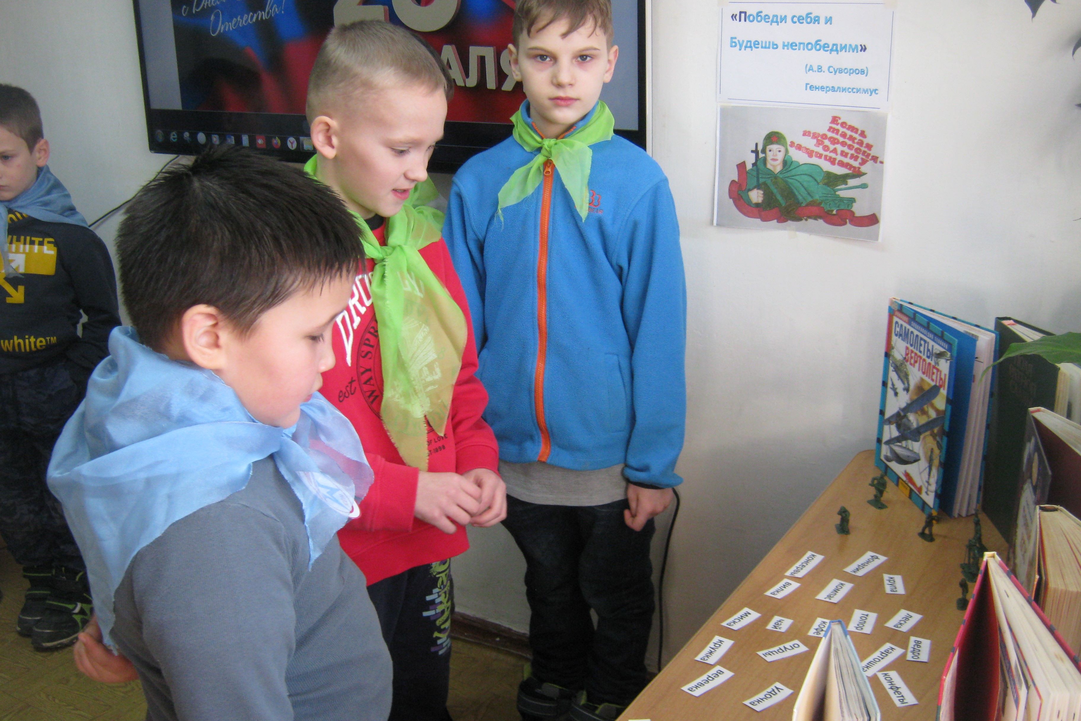 В течение недели сотрудники детской библиотеки № 7 проводили патриотические часы с учениками 4-х классов СОШ № 74 и СОШ №59 и постоянными читателями библиотеки. Дети слушали рассказ о том, что наша армия прошла славный путь, оберегая мир и покой граждан России. Всегда, во все времена русская армия славилась своими солдатами. Недаром в народе говорят: «Русский солдат – умом и силой богат». Дети принимали участие в игровой программе, где проявили знания и смекалку, читали стихи о наших славных воинах, вспоминали полководцев и военачальников Великой Отечественной войны, читали рассказы о войне. В завершении мастерили открытки-поздравления для своих дедушек и пап.