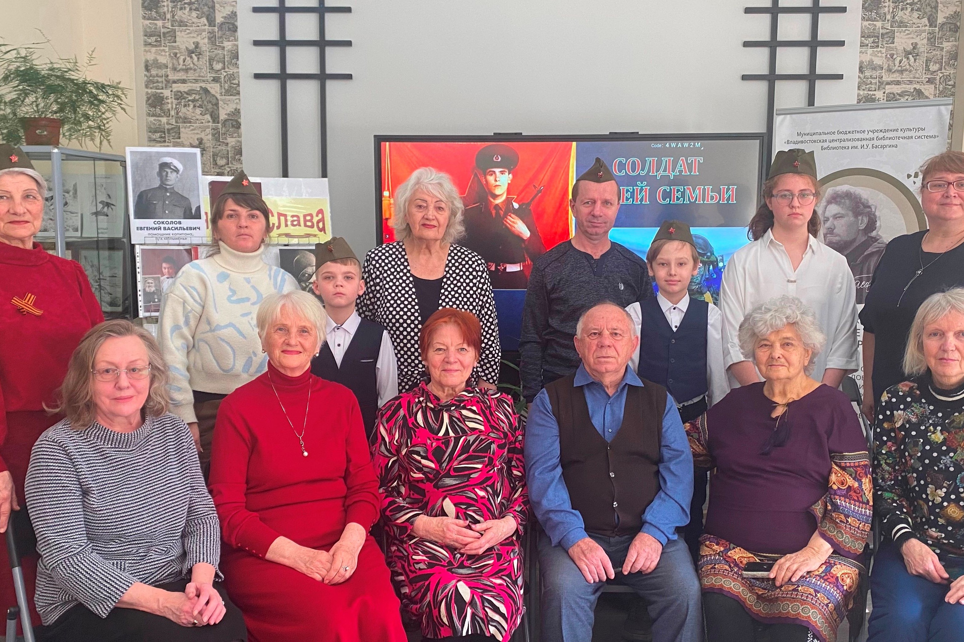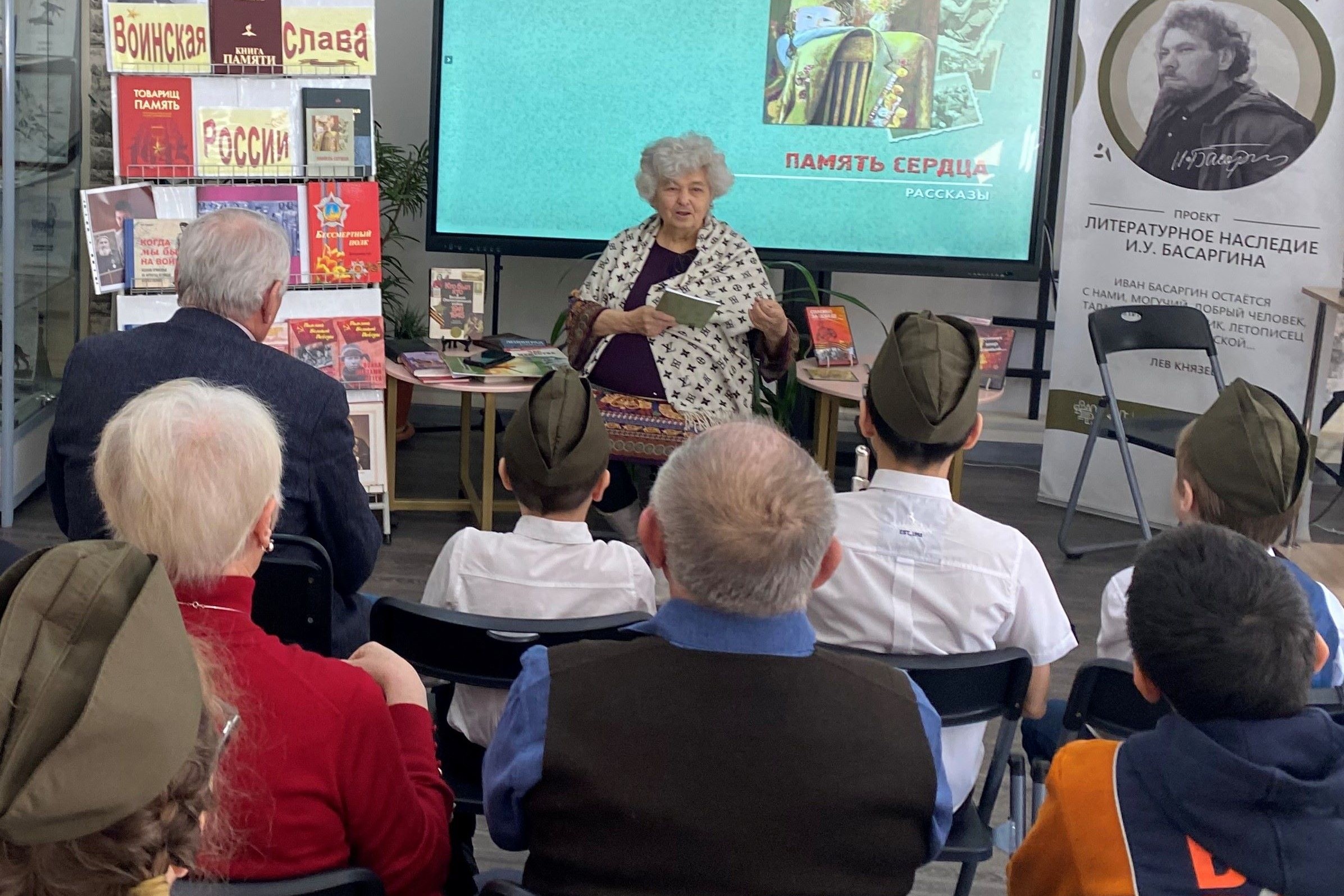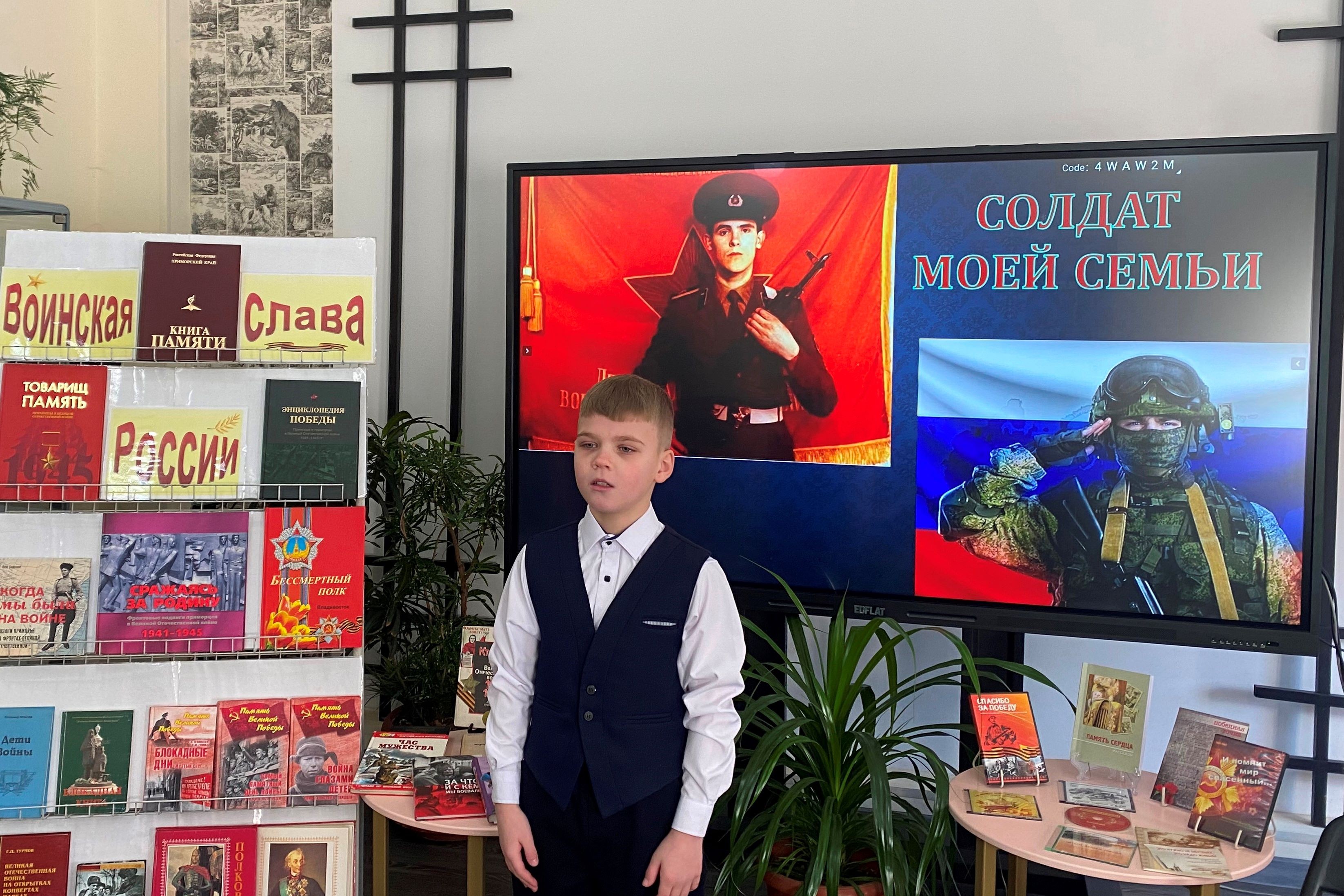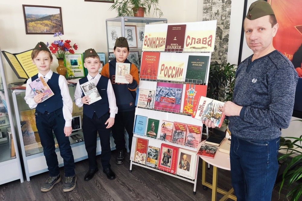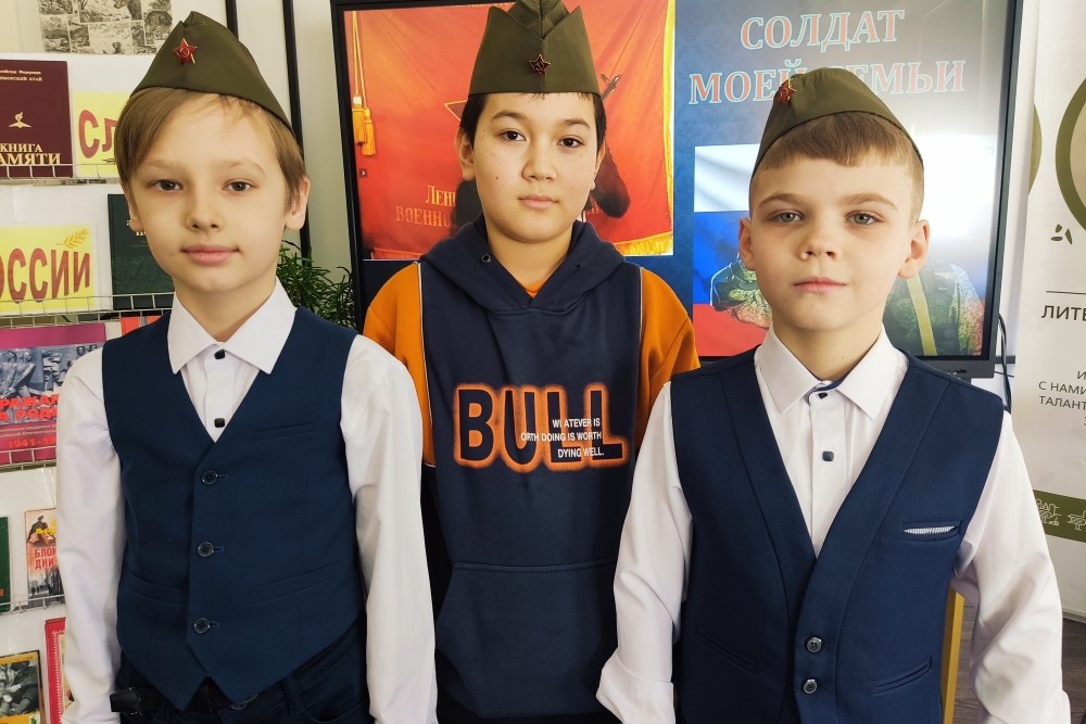 В сборник вошли письма с фронта, страницы из жизни блокадного Ленинграда, воспоминания о победе под Сталинградом. Под марш «Служить России» продолжился час памяти. На экране – советский солдат и воин СВО. На стенде портреты ветеранов войны.