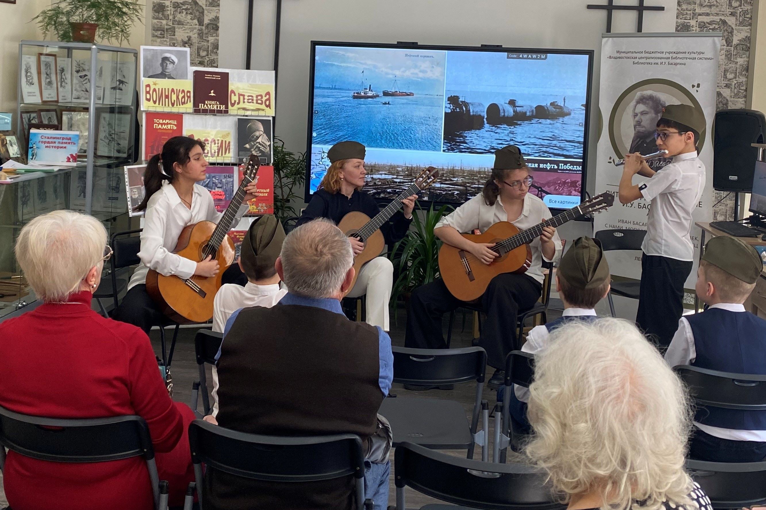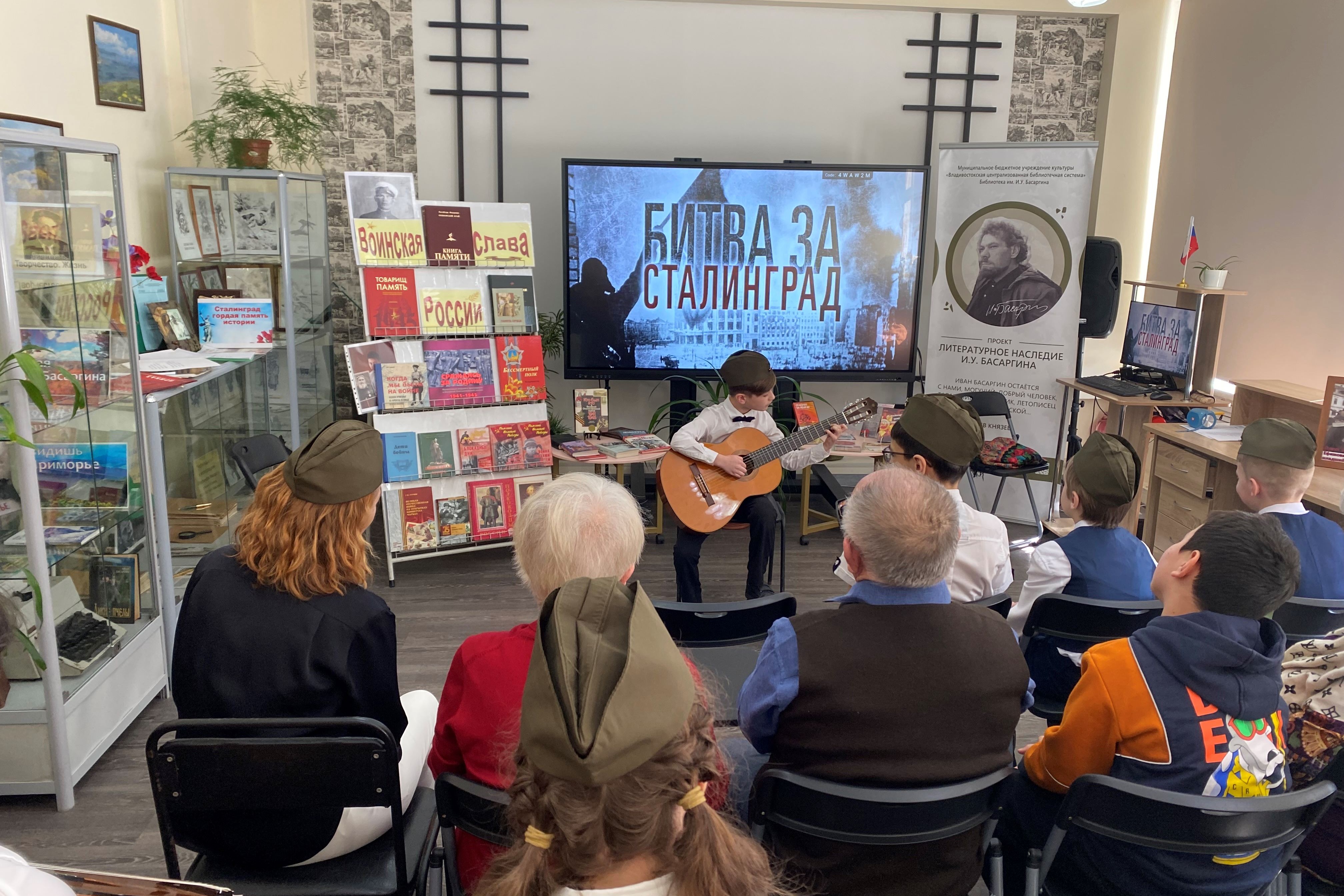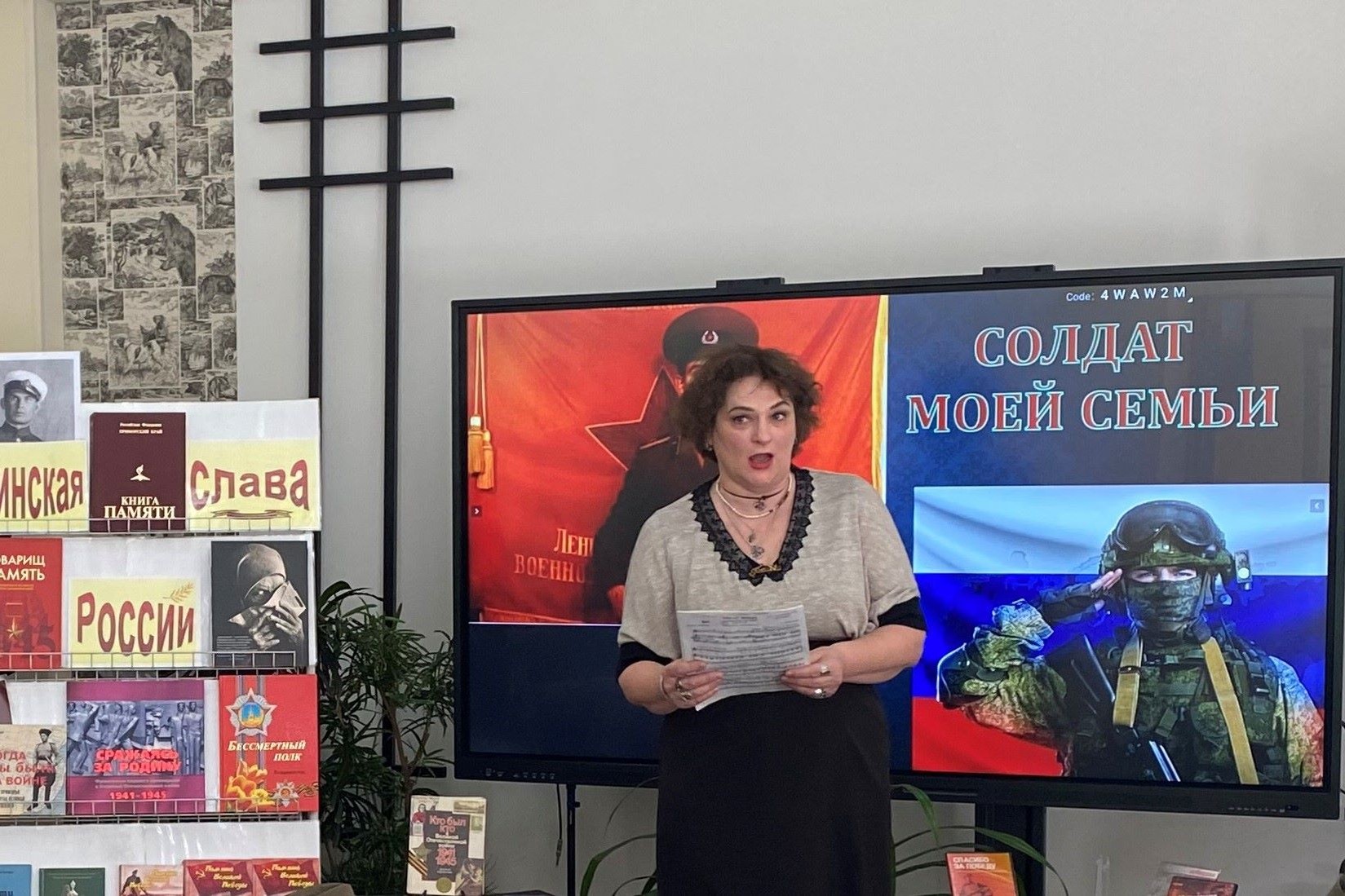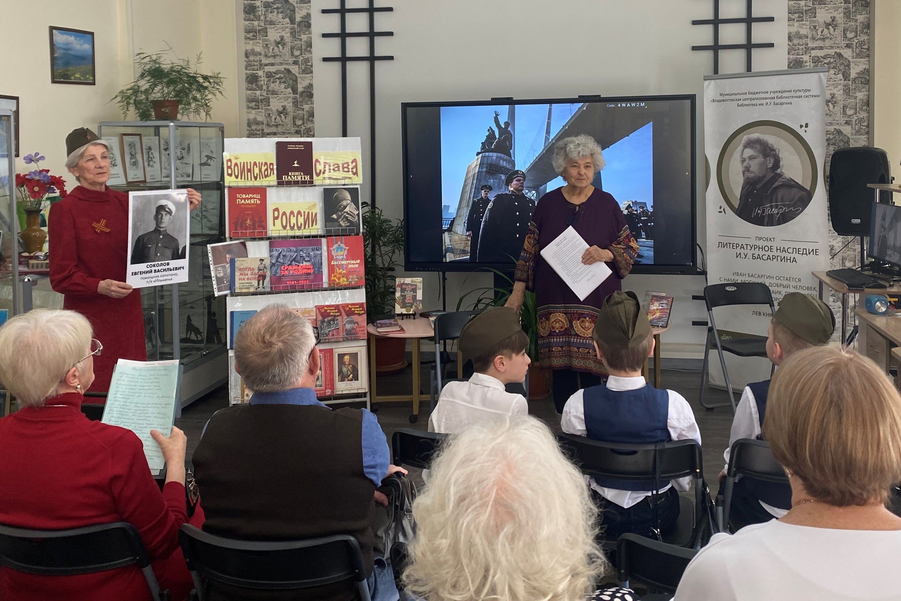 В сборник вошли письма с фронта, страницы из жизни блокадного Ленинграда, воспоминания о победе под Сталинградом. Под марш «Служить России» продолжился час памяти. На экране – советский солдат и воин СВО. На стенде портреты ветеранов войны.