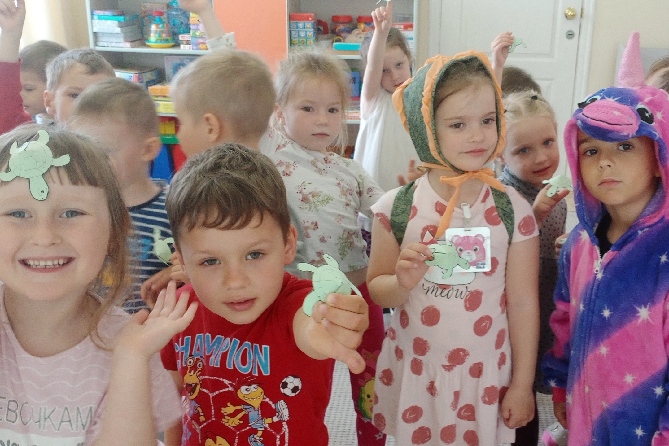 Для поддержки акции воспитанники детского сада № 49, собравшись в круг провели флэшмоб весёлых черепах, используя костюмы и подаренные библиотекой фигурки черепах из цветной бумаги.