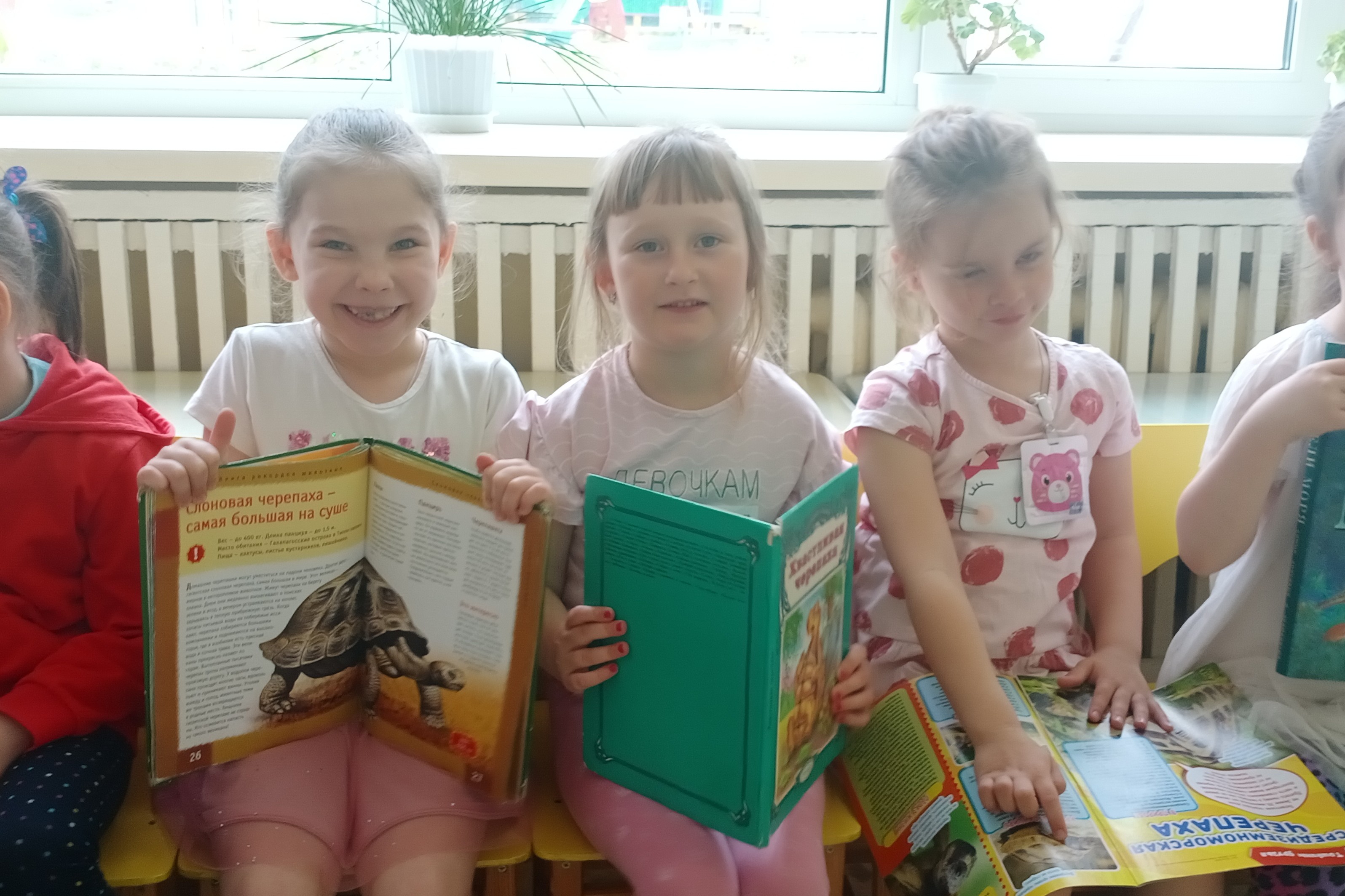 Дошкольникам были представлены красочные энциклопедические издания, содержащие сведения о разнообразных видах черепах. Дети узнали, что черепахи бывают морскими и сухопутными; что домик черепахи называется «панцирь», у разных черепах панцирь тоже разный; что черепаха является символом мудрости, богатства и долголетия. Самыми древними и крупными являются слоновые черепахи, живущие на Галапагосских и Сейшельских островах, которые сейчас находятся под угрозой уничтожения. Удивили детей и необычные названия черепах: зубчатая, лучистая, звездчатая, паучья, угольная, плоскохвостая, попугаевоголовая, пантеровая, шишковатая. Ещё дошкольники прослушали поучительную сказку о хвастливой черепахе, которая вызвала много радости и веселья.