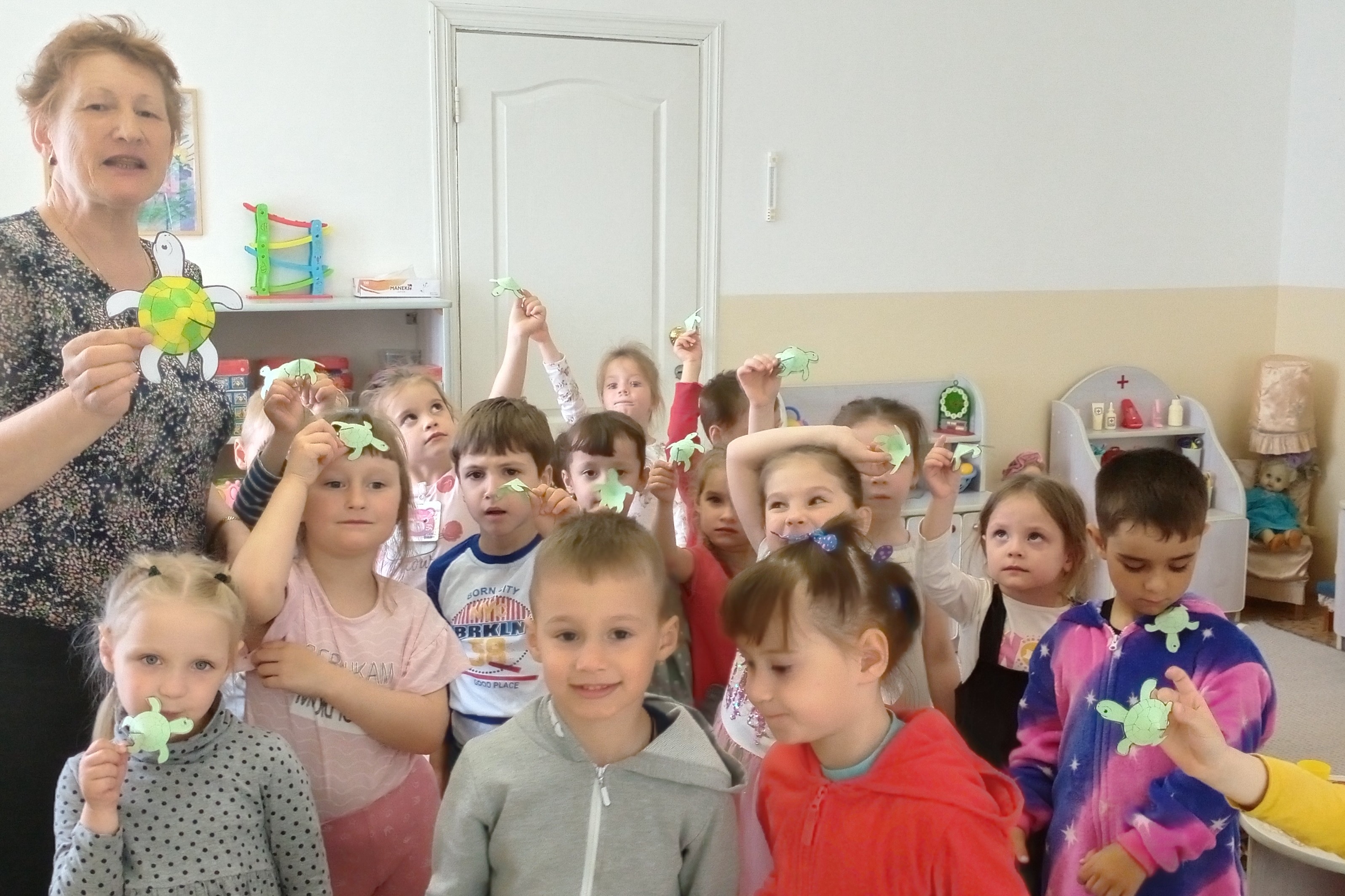 Для поддержки акции воспитанники детского сада № 49, собравшись в круг провели флэшмоб весёлых черепах, используя костюмы и подаренные библиотекой фигурки черепах из цветной бумаги.