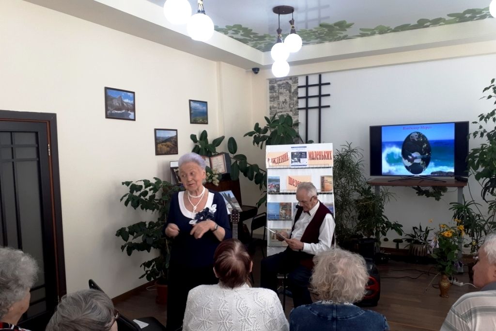 Подробно о жизни и судьбе рассказал гостям библиотеки сам Владимир Владимирович. Была показана электронная презентация «Мои года – моё богатство». О том, как не расстаётся с гитарой с курсантских лет, и во время дальних морских походов этот музыкальный инструмент всегда был рядом. Рассказал об одной из спасательных операций, в которой он участвовал на ледоколе «Адмирал Макаров» более четверти века назад у берегов Аляски. Те реальные события легли в основу американской мелодрамы «Все любят китов», показанной и в России в 2012 году.