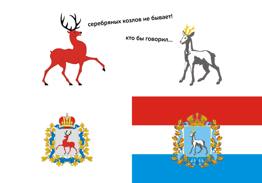 Красный олень на гербовом флаге Нижегородской области был утверждён Александром II. А на флаге Самарской области разместился серебряный дикий козёл.