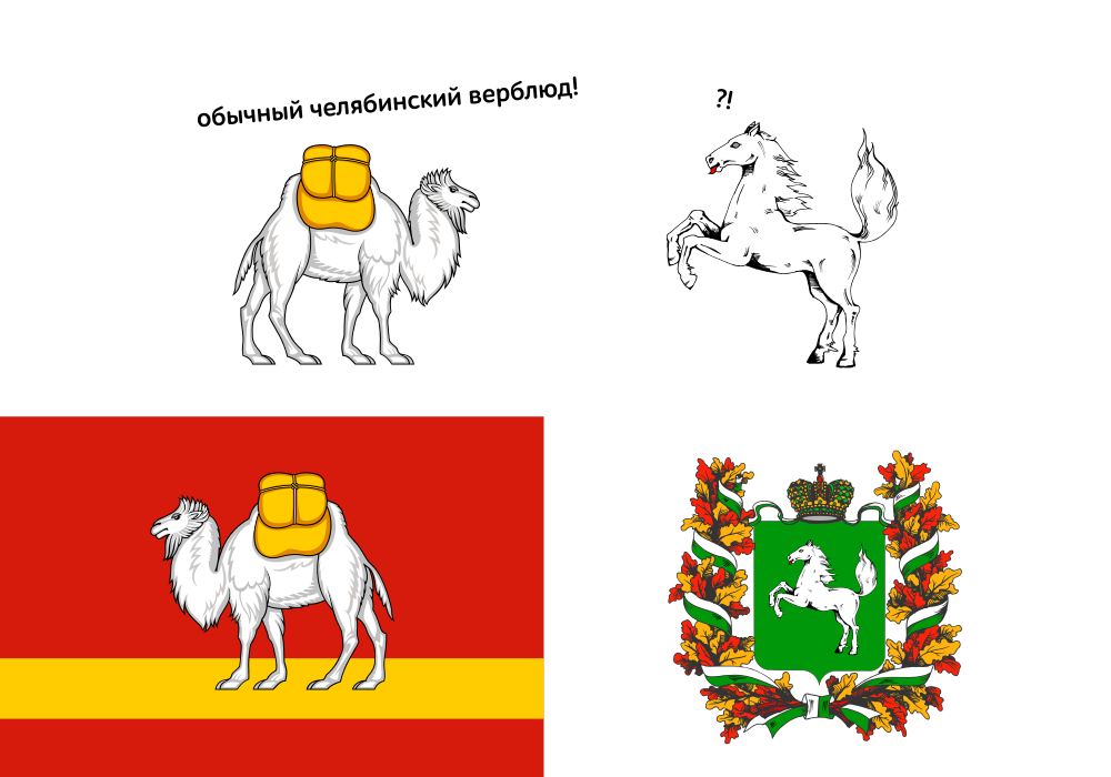 Верблюд на флаге Челябинской области напоминает о древних торговых путях, которые там проходили. А на гербовом флаге Томской области изображён серебряный конь.