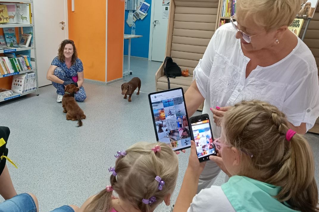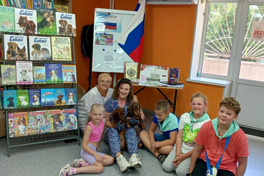 И такое событие произошло: встреча детей из Детского развивающего центра «Дай пять!» со старыми друзьями библиотеки Алёной Саитовой https://t.me/muskatdog и сап-таксами Сашими и Ханни. В начале встречи заведующий библиотекой Елена Янсон с помощью красочного наглядного материала рассказала ребятам о том, как правильно ухаживать за собакой, как гулять, кормить, о том, что обязательно нужно соблюдать правила безопасности при общении с собакой, не важно, своей или чужой, и о том, что собака – это большая ответственность.