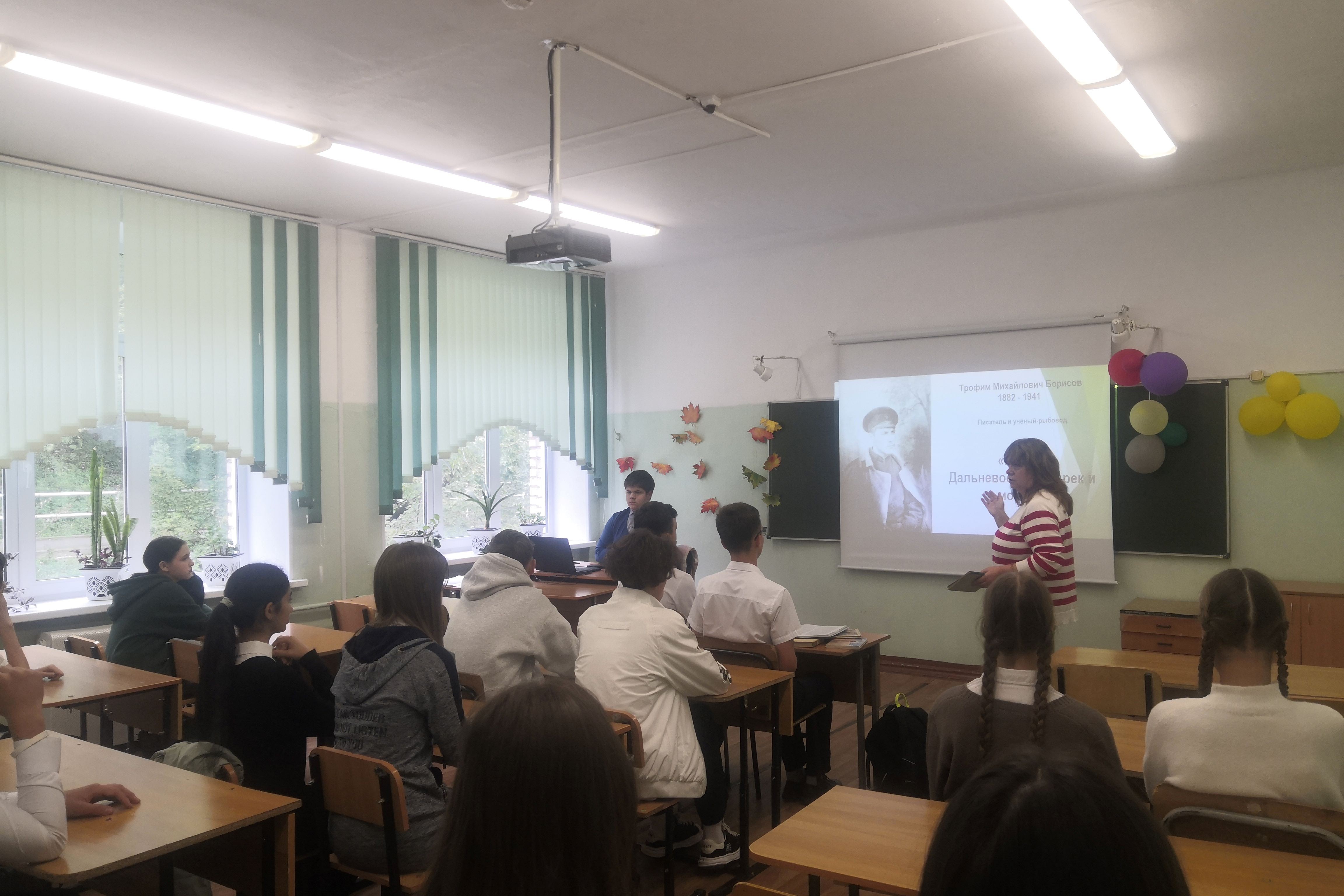 Урок краеведения «Певец дальневосточных рек и морей» организовала библиотека № 16 для учащихся 9 «А» класса СОШ № 43. Посвящен он был жизни, деятельности и творчеству Трофима Михайловича Борисова. Ребятам рассказали о том, что известный рыбовод, выдающийся ихтиолог, дальневосточный писатель Трофим Борисов, организовывавший в нивхских стойбищах на Нижнем Амуре первые рыболовецкие колхозы, — современник Владимира Арсеньева. Трофим Михайлович прочитывал большое количество журналов, посвященных науке, в которых были упоминания о невероятных гипотезах и новшествах. Впоследствии некоторые из них нашли место в его произведениях. Но иногда писатель описывал изобретения настолько нереальные для того времени, что даже ученые не могли допустить, что когда-нибудь что-то подобное будет создано. Он предсказал, что сайру будут ловить не сетями, а огромными подъемниками с помощью электросвета. Он разработал метод, благодаря которому по паразитам, чешуе лосося, отловленного в Амуре, можно определить, откуда пришла, где родилась. Борисов был одним из авторов стратегии сохранения нерестилищ лососей на Дальнем Востоке. «Кроме золота в России есть бесценный ресурс — лосось, которого надо беречь», — призывал рыбовод.