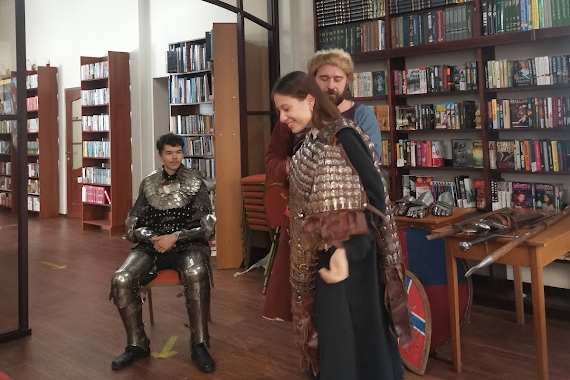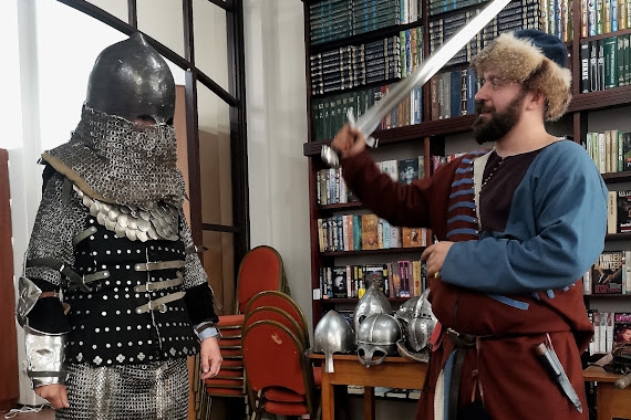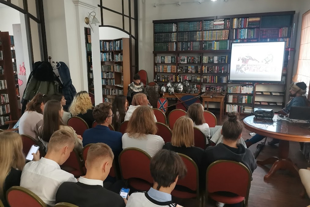 22 октября в библиотеке №10 прошла встреча старшеклассников школы №6 и клуба исторической реконструкции «Гарнизон». Руководитель КИР «Гарнизон» Роман Волков предстал перед слушателями в реконструированном костюме новгородского купца. Роман рассказал о феномене исторической реконструкции, «живой истории», тщательно и кропотливо восстанавливаемой энтузиастами. Большую роль в этом процессе играет самообразование, ведь большинство сведений, необходимых для точного воссоздания костюмов древних требует глубоких знаний истории, а еще непосредственное создание костюмов еще и ремесленных навыков. Особенно трудоемкий процесс изготовления доспехов, будь то древнерусский ламинарный доспех, плетение кольчуги или же средневековый панцирь. Все вещи хоть и изготавливаются из современных материалов, имеют аутентичный вид.