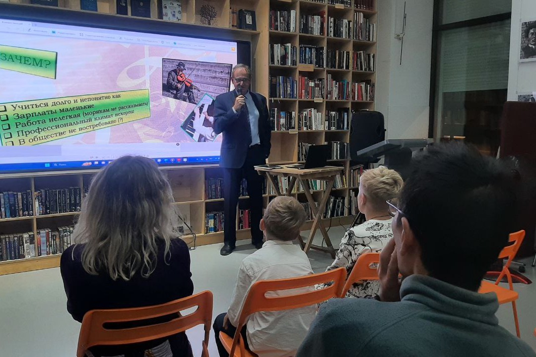 В рамках программы «Вечерняя библиотека» на прошлой неделе в молодежной библиотеке состоялась лекция-встреча с Леонидом Грауманом «Сначала были звуки», на котором обсуждали непривычные для читателей вопросы: кто живет в мире музыки, и как из таинственно поблескивающих изящно выгнутых музыкальных инструментов и с покрытых непонятными закорючками страниц возникают прекрасные звуки.