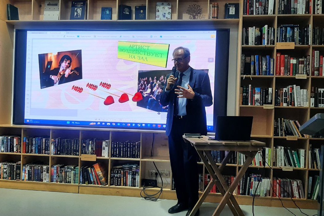 В рамках программы «Вечерняя библиотека» на прошлой неделе в молодежной библиотеке состоялась лекция-встреча с Леонидом Грауманом «Сначала были звуки», на котором обсуждали непривычные для читателей вопросы: кто живет в мире музыки, и как из таинственно поблескивающих изящно выгнутых музыкальных инструментов и с покрытых непонятными закорючками страниц возникают прекрасные звуки.