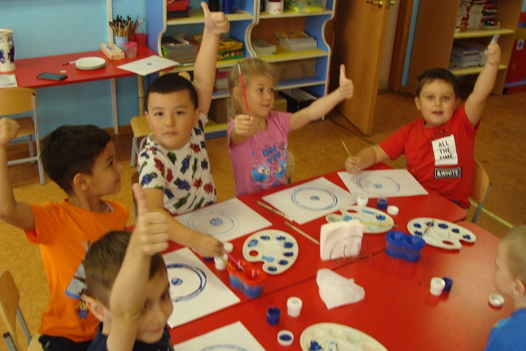 Всем ребятам захотелось немедленно почувствовать себя художниками. Подробно разобрали все элементы гжельской росписи с помощью плакатов, иллюстраций и слайдов презентации. Дошколята кропотливо и аккуратно расписали тарелочки и чайнички в технике гжель. Дети узнали, как появляются мазки разных оттенков, и если с одной стороны обмакнуть кисть в синюю гуашь, а другой край кисти в белую, то получится тот самый эффект – плавный переход двух красок. У ребят вышли замечательные яркие и нарядные изделия.