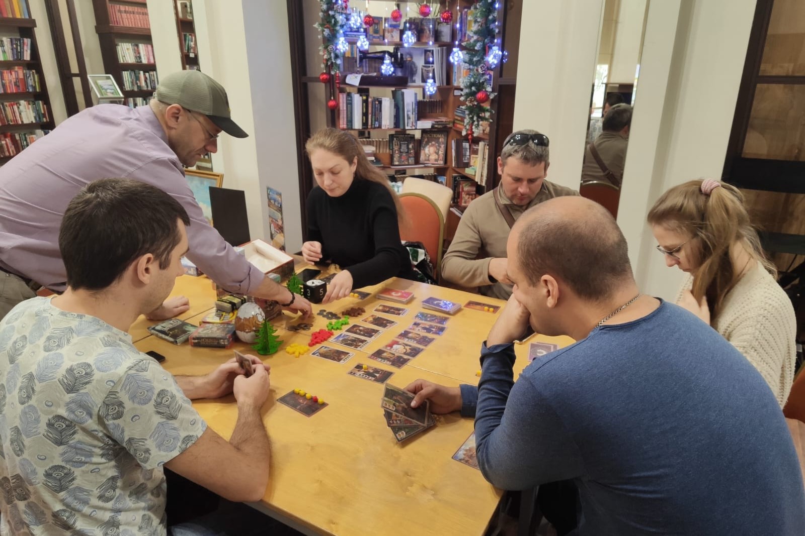 Участники встречи могли поиграть с друзьями в настольные игры: «Роскошь», «Город счастья», «Всмятку», «Руммикуб», «Смешанный лес», «Бонанза», «Легенды Эфирии», «Королевские хроники» и другие. «Имаджинариум. Новый год» оказалась для всех самой захватывающей настольной игрой. Этот предновогодний подарок стал настоящим сюрпризом для любителей игр. 64 карты с весёлыми зимними рисунками на новогоднюю тематику и 6 разноцветных фишек игроков в форме оленей создали за игровым столом праздничную атмосферу! Настольный мир ни разу не был таким волшебно-загадочным! Настоящий Дед Мороз среди игр.