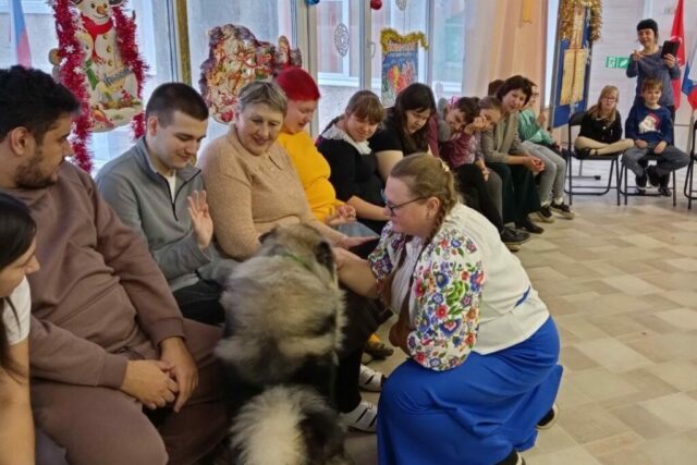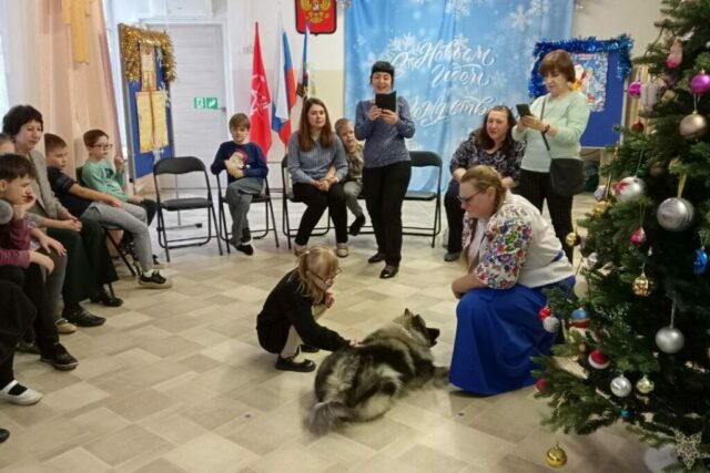 Вторая часть занятия библио-канистерапии была интерактивной – ведь в гостях у ребят сегодня побывала Ольга Галкина, тренер по танцам с собаками, со своей питомицей по кличке Есмина (Еся) породы вольфшпиц (кеесхонд). Еся поразила детей и взрослых своими навыками послушания и вместе с Ольгой исполнила зажигательный танец. Все трюки и элементы номера зрители принимали с восторгом. Традиционно в конце мероприятия сделали общее фото и каждый желающий получил на память снимок у мобильной фотозоны «Здравствуй, Новый год!», которую библиотекари создали специально для новогодних встреч.