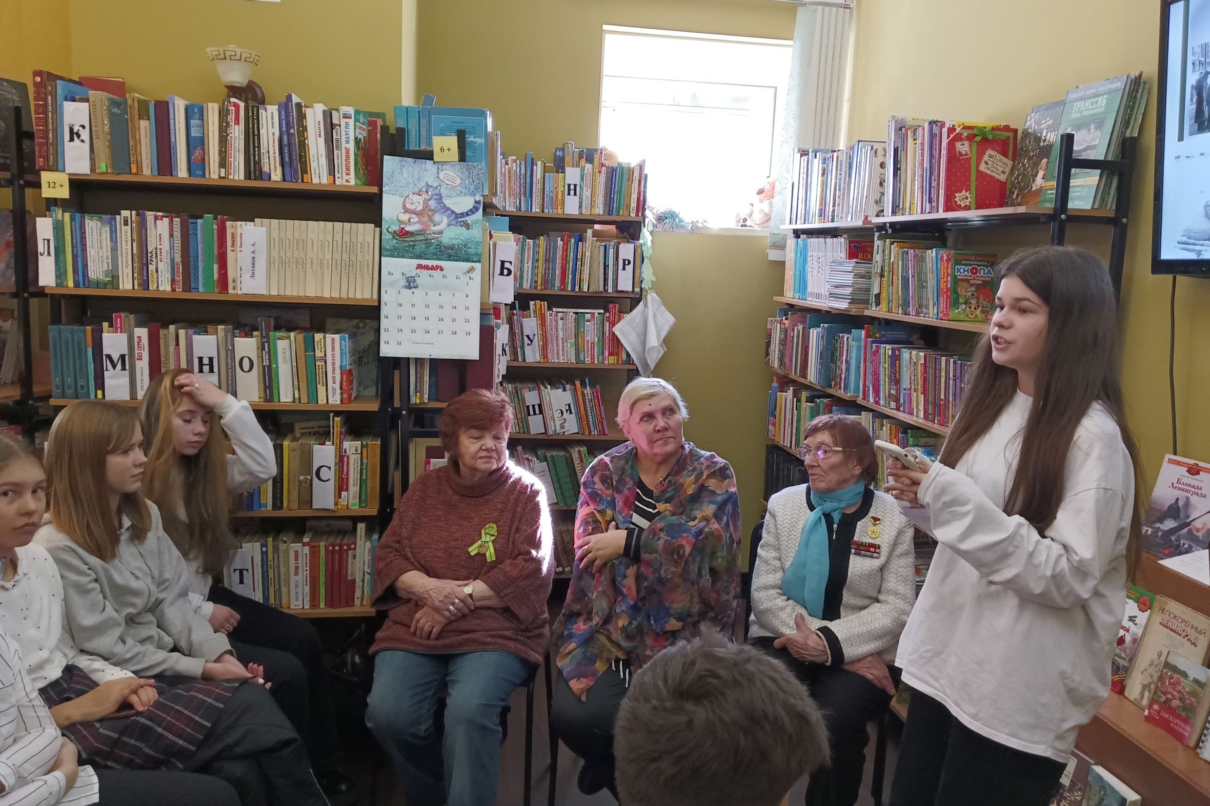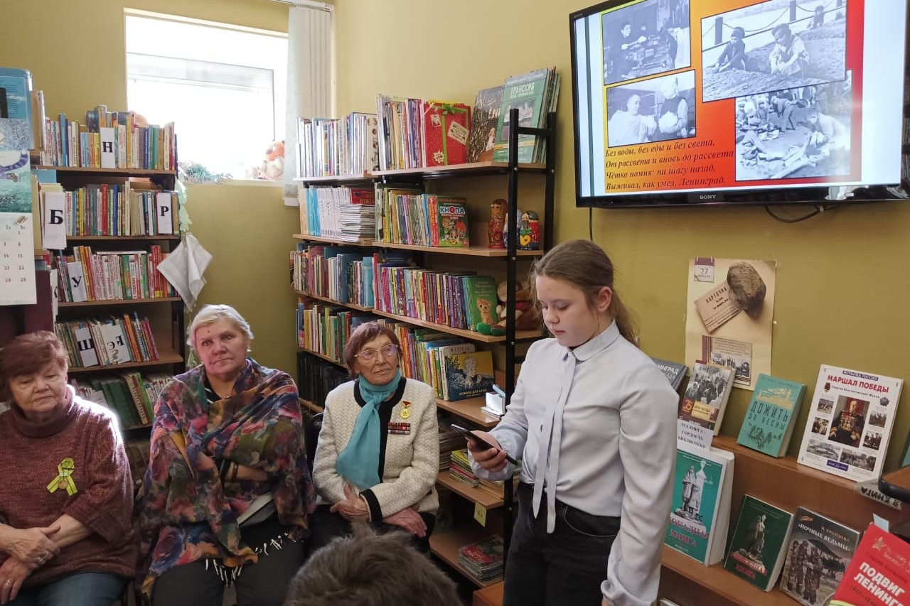 Почетными гостями библиотеки были Крамскова Людмила Федоровна, член Городской общественной организации «Жители блокадного Ленинграда» и Негода Лидия Ивановна, участник ВОВ. Они поделились воспоминаниями, рассказали о детском вкладе в освобождение Ленинграда, как учились в осажденном городе, ответили на вопросы, а дети прочитали стихи О. Берггольц, О. Аникеевой, Ю. Воронова.