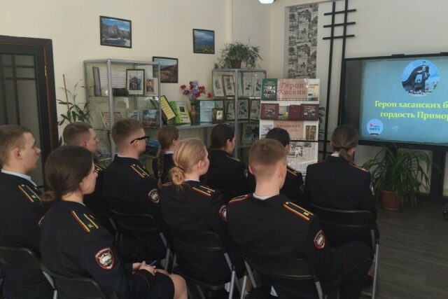24 февраля в библиотеке им. И.У. Басаргина с курсантами 1-го курса ВФ ДВЮИ МВД России им. И. Ф. Шилова прошло мероприятие, посвящённое одной из героических и трагических страниц истории Дальнего Востока – вооружённому конфликту у озера Хасан 1938 года. Мероприятие прошло в рамках акции «Хасанский бой – гордость Приморья»