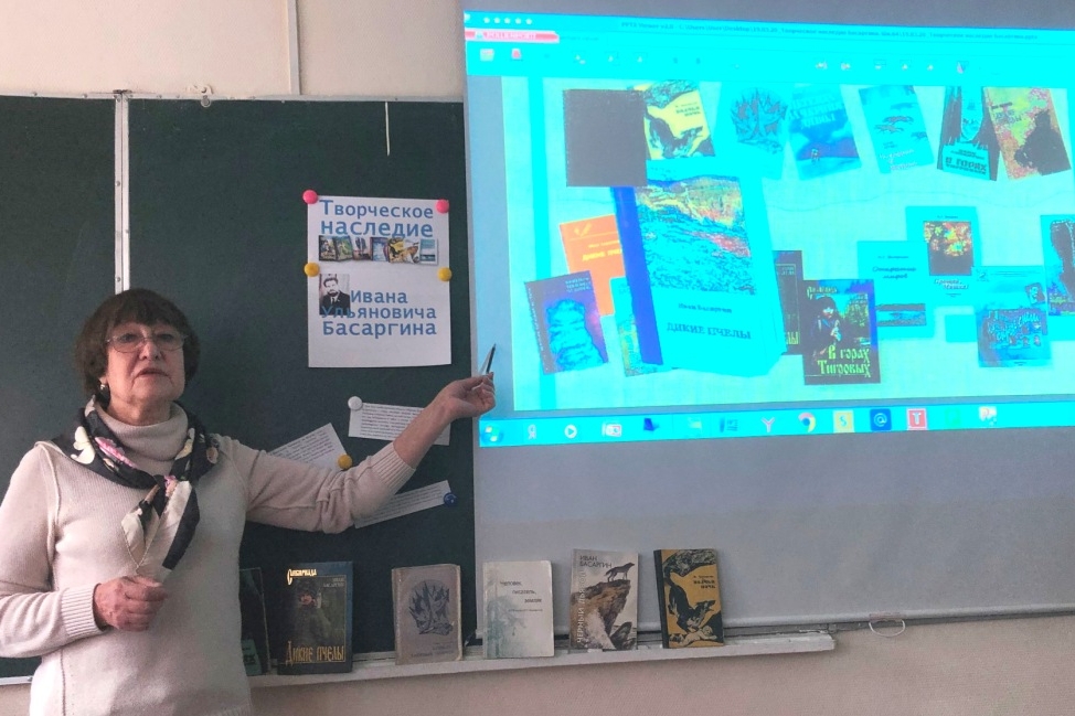 Слайды презентации и выставка книг (некоторые из архива библиотеки) представили участникам круглого стола произведения И.У. Басаргина, на столах перед учащимся была выложена подборка цитат из отзывов писателей, читателей, исследователей творчества И.У. Басаргина о произведениях писателя. «За книжку про Акимыча большое Вам русское спасибо. Чудо как хорошо. Читаешь и как будто наполняешься неизъяснимой божественной мудростью у тихо потрескивающих таёжных костров. Здорово это!» – цитата из послания автору знаменитого актера и режиссера П.П. Кадочникова. «В повести «Черный Дьявол» главный герой полуволк–полусобака наделен человеческими чертами… С помощью этого персонажа Басаргин выявляет истинную суть героев–людей, иногда глубоко скрытую, которая отчетливо проступает во взаимоотношениях с животным, а значит, с самой природой», – писала о повести «Черный Дьявол» исследователь творчества И.У. Басаргина О.Л. Дизендорф. «Видишь всё то, что Вами написано. Я считаю умение художника заставить читателя увидеть сказанное величайшим даром. Вы им обладаете в самой высокой мере» – цитата из письма И.У. Басаргину филолога Н.М. Петренко и др.