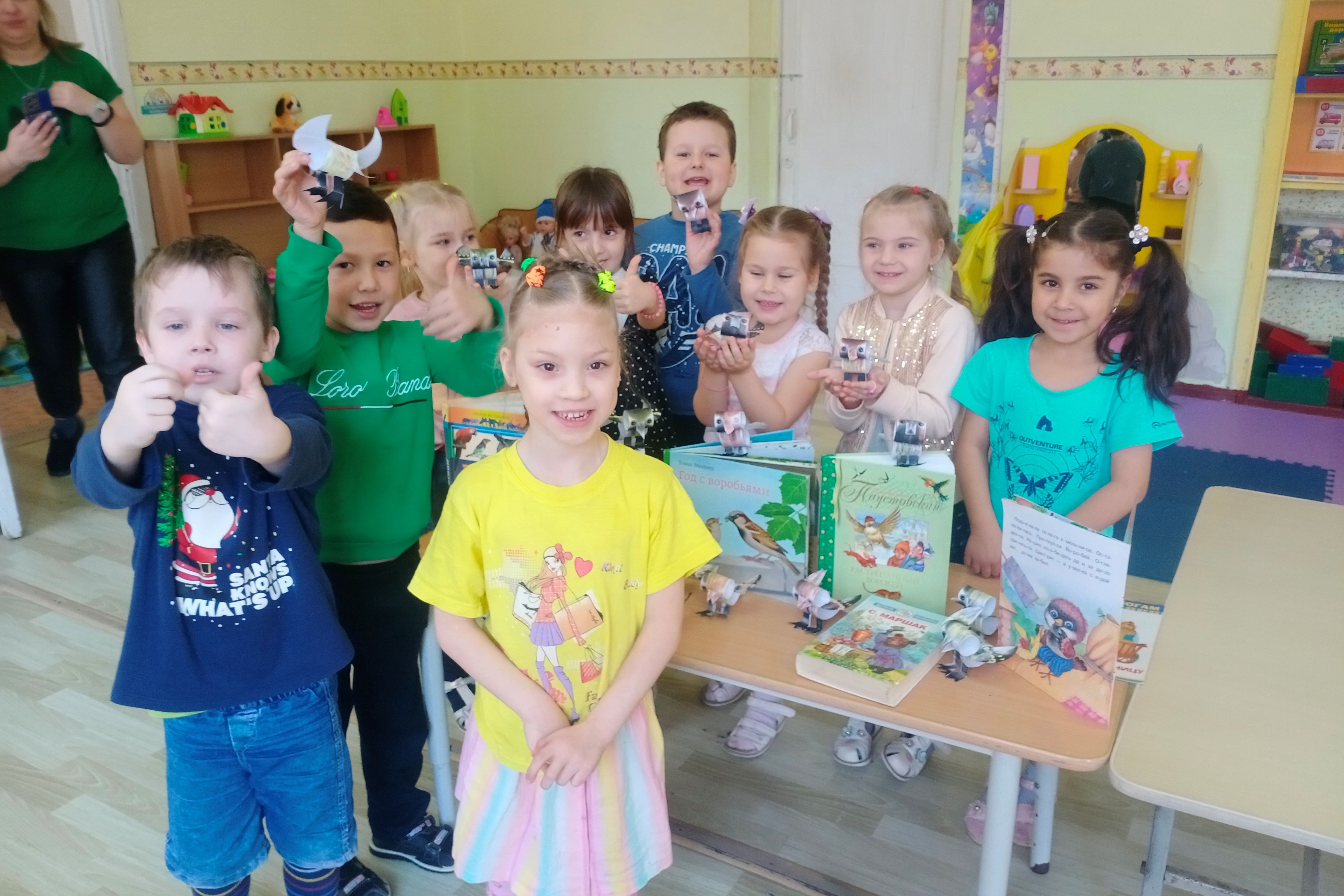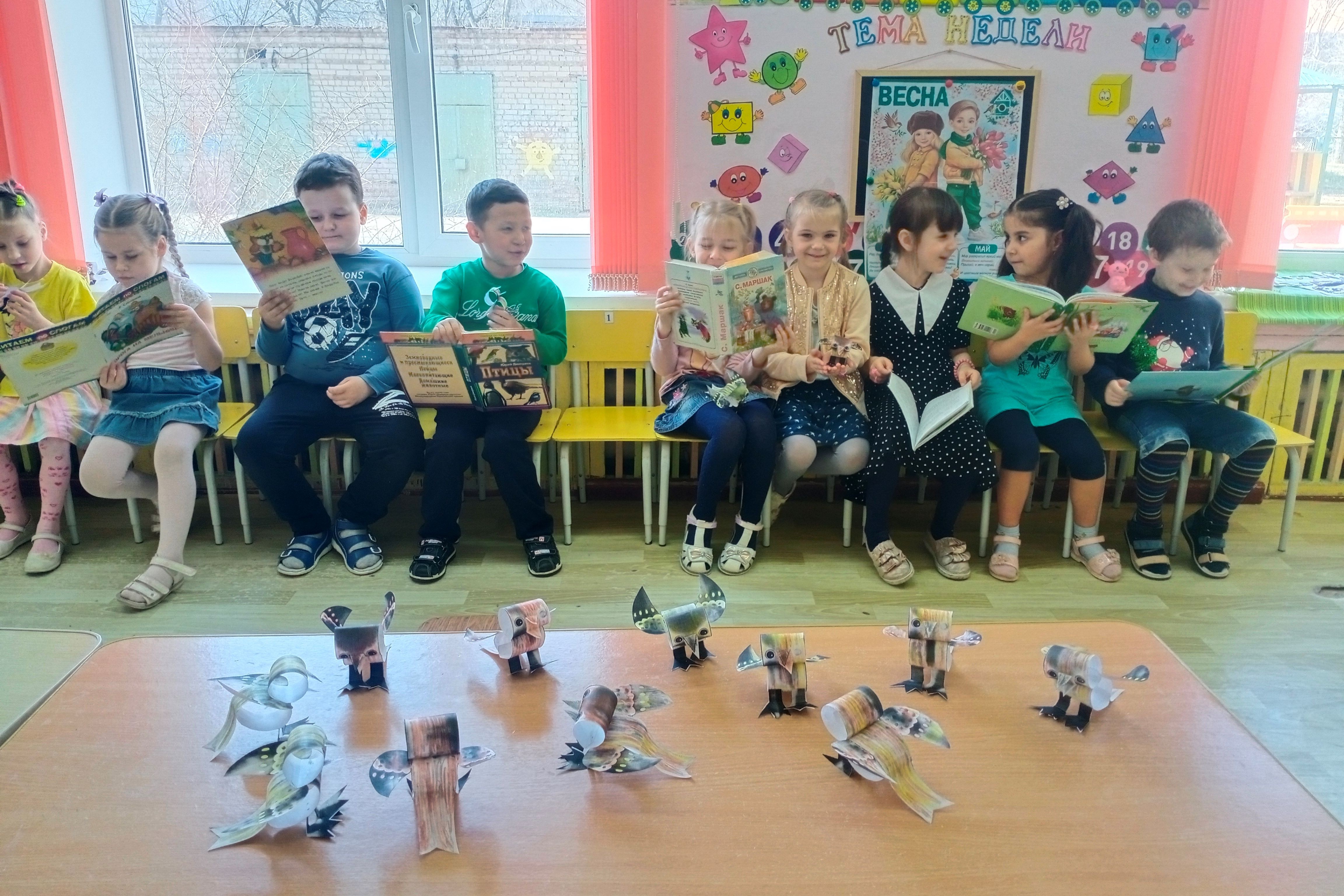 Дети разгадывали рифмованные загадки и отвечали на весёлые вопросы птичьей викторины. Особый интерес вызвали сказки и истории о воробьях. Из книги Томаса Мюллера «Год с воробьями» с прекрасными иллюстрациями автора дети узнали как воробьи строят гнёзда, как выглядят яйца и птенцы птиц, о появлении птенцов и их дальнейшей жизни. Иллюстрации позволили просмотреть каждую страничку, книга произвела впечатление на всех детей. Понравилась поучительная сказка нашего классика Мамина- Сибиряка «Сказка про Воробья Воробеича, Ерша Ершовича и весёлого трубочиста Яшу» о дружбе, умении понимать друг друга и делиться друг с другом.