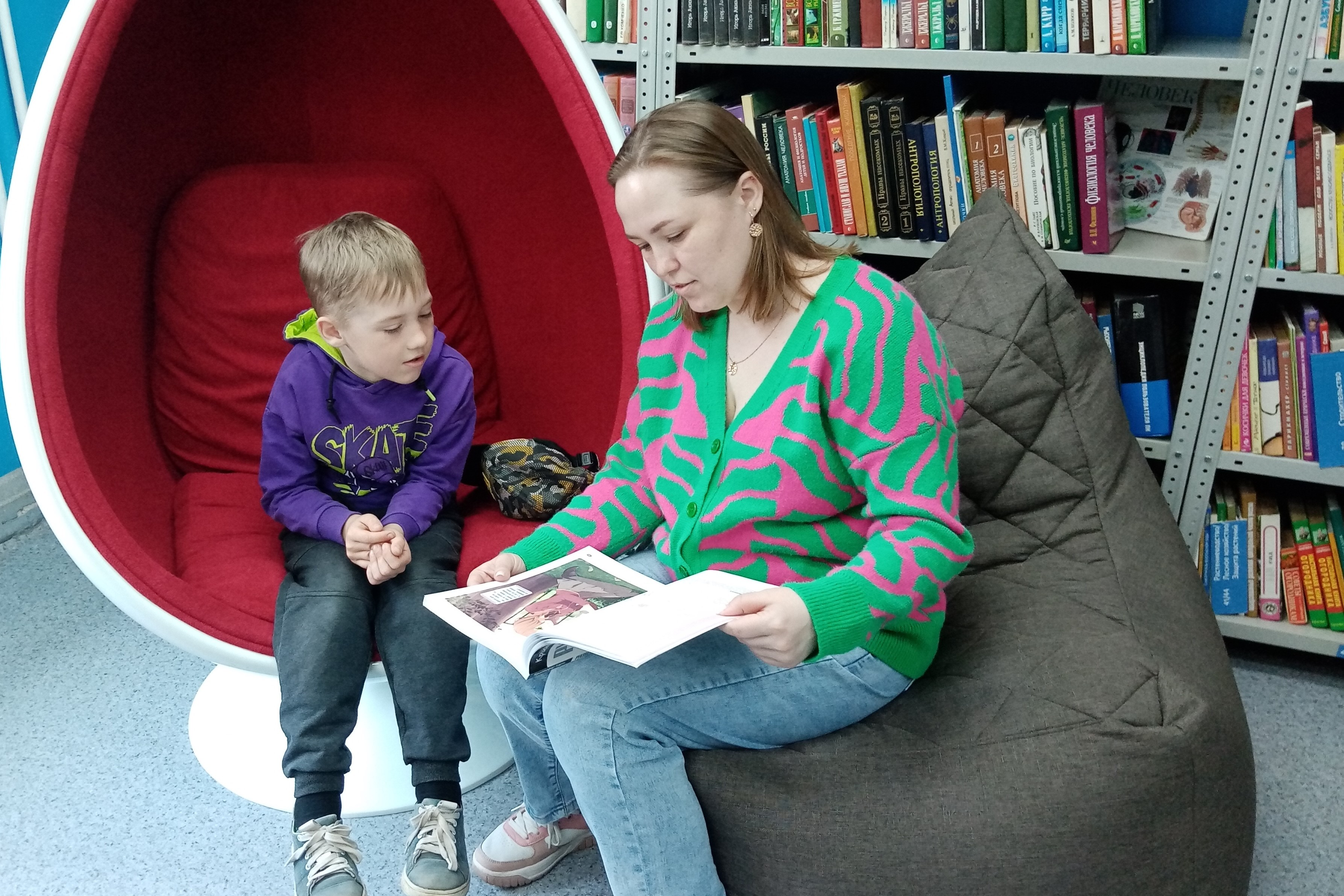 А для тех, кто хотел побыть в тишине и почитать, работала Фотозона в Синем зале «Уютные чтения с…» (кресло – капсула, кресла — пуфы). Библиосумерки на Заре «PROчтение для всей семьи» прошли весело, креативно и познавательно.