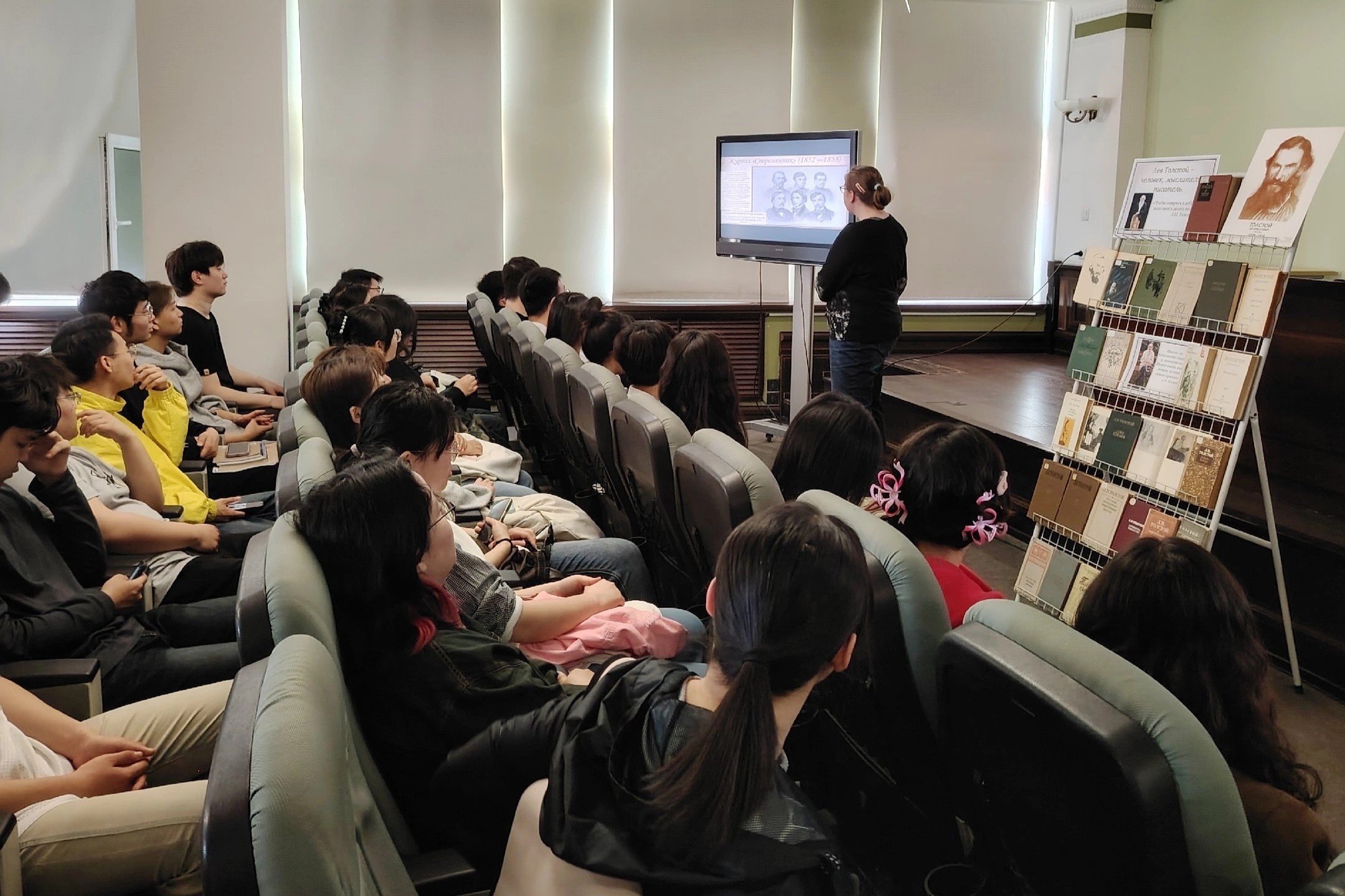 Аудитория собралась весьма разнообразная, помимо магистрантов-филологов и бакалавров лингвистики ДВФУ из Китая, Таджикистана и Вьетнама, мероприятие посетили и слушатели Центра русского языка и культуры по инициативе и организации преподавателей ЦРЯК ДВФУ Ксении Игоревны Лукьяненко и Риммы Ивановны Одинцовой, а также доцент кафедры РКИ ВИ-ШРМИ ДВФУ Фадеева Ирина Анатольевна. Встреча проходила в уютном конференц-зале Научной библиотеки ДВФУ благодаря главному методисту Козиной Юлии Анатольевне, которая также в очередной раз собрала замечательную выставку с произведениями Толстого, дополняющую выступление спикера.