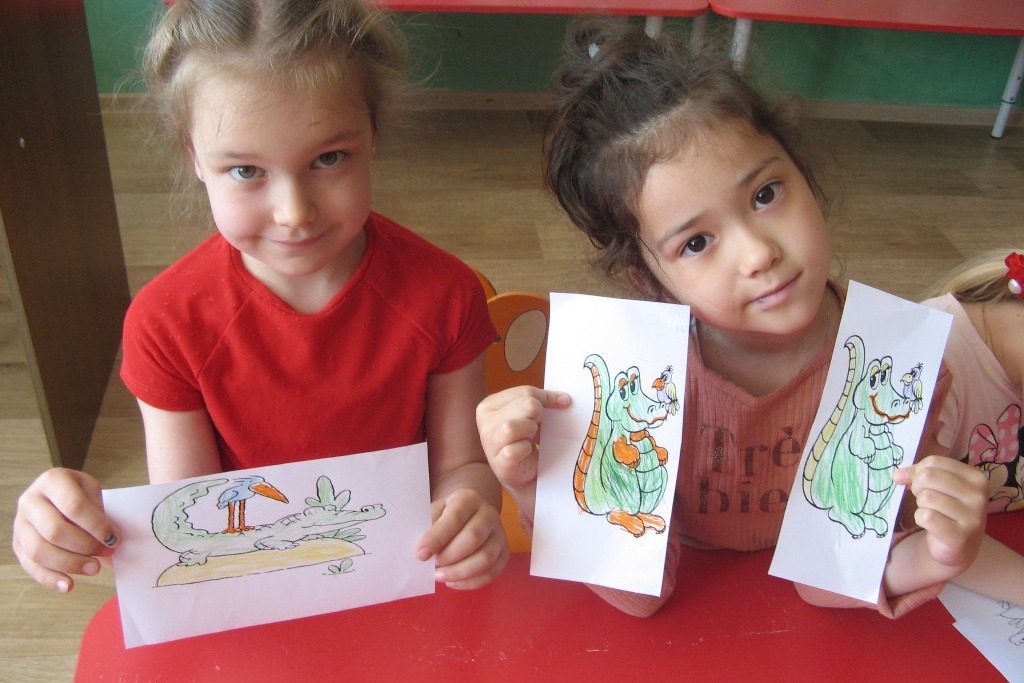 Вместе с детьми прочитали сказку и рассмотрели прекрасные иллюстрации Леонида Тишкова. Главный герой сказки Крокодил, который воспитал птичку, как собственного ребенка. Заботился и оберегал ее. Главная мысль сказки заключается в том, что добрые чувства способны творить чудеса.