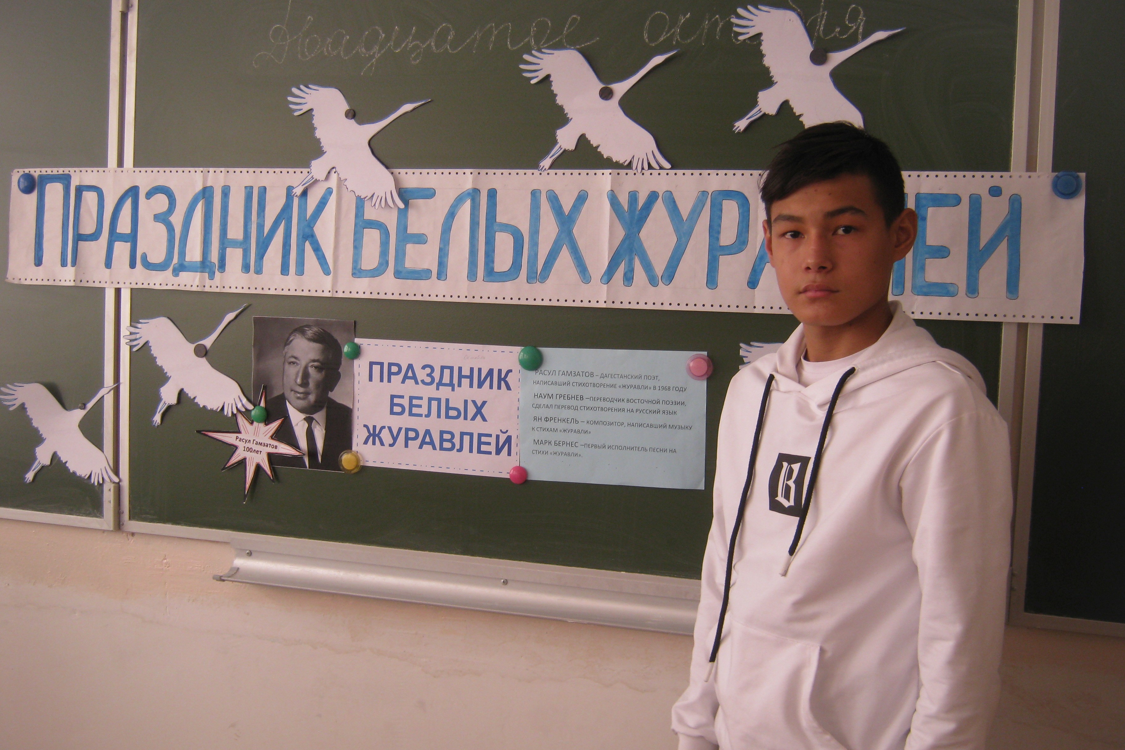 Восьмиклассники слушали историю праздника, слушали песню, читали сами стихотворение «Журавли» и сделали свой вывод: Журавли — это, наверное, и есть то, что зовется Родиной, то от чего вдруг замрет сердце и на душе становится покойно и легко. Журавли не просто птицы, они вестники тех, кого с нами уже рядом нет и не только воины, но все наши родные и близкие. И пока мы слушаем песню, мы помним. Помним Расула Гамзатова, братьев Газдановых, наших родных предков защитивших Родную землю и подаривших нам мир.