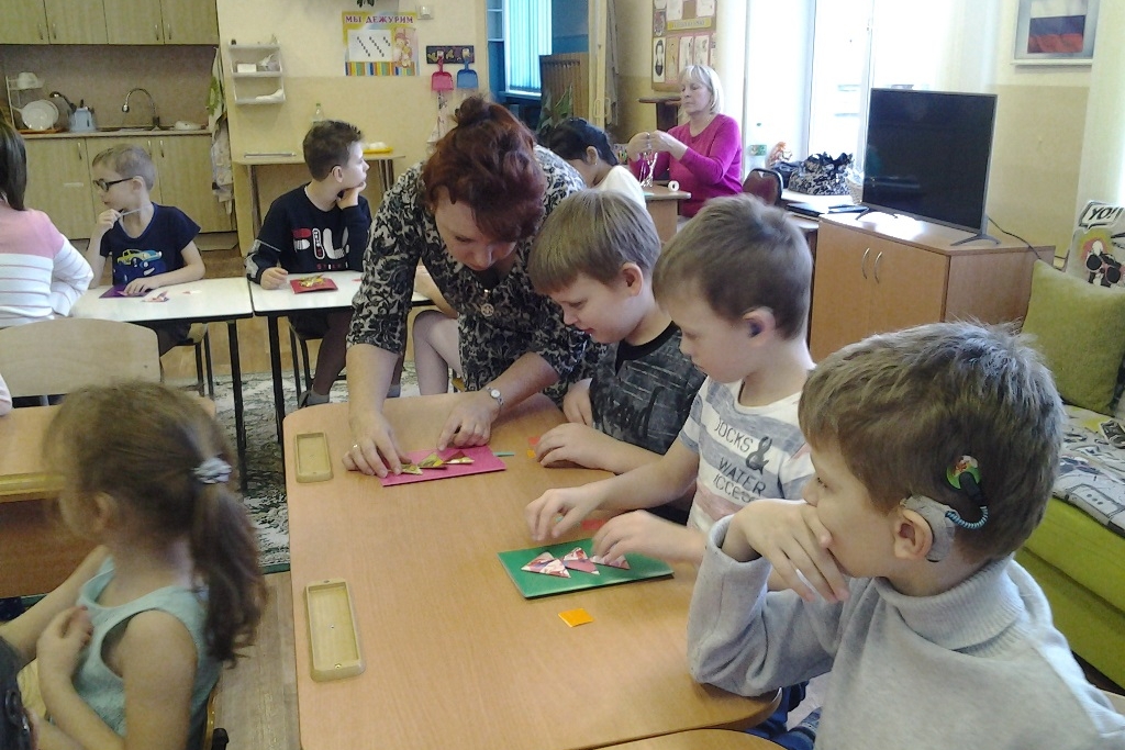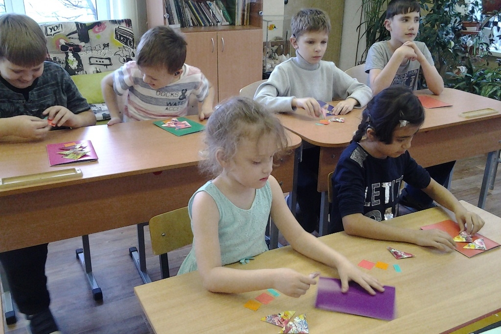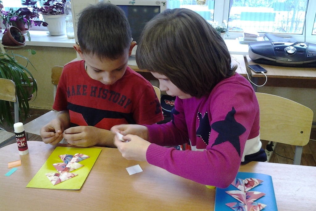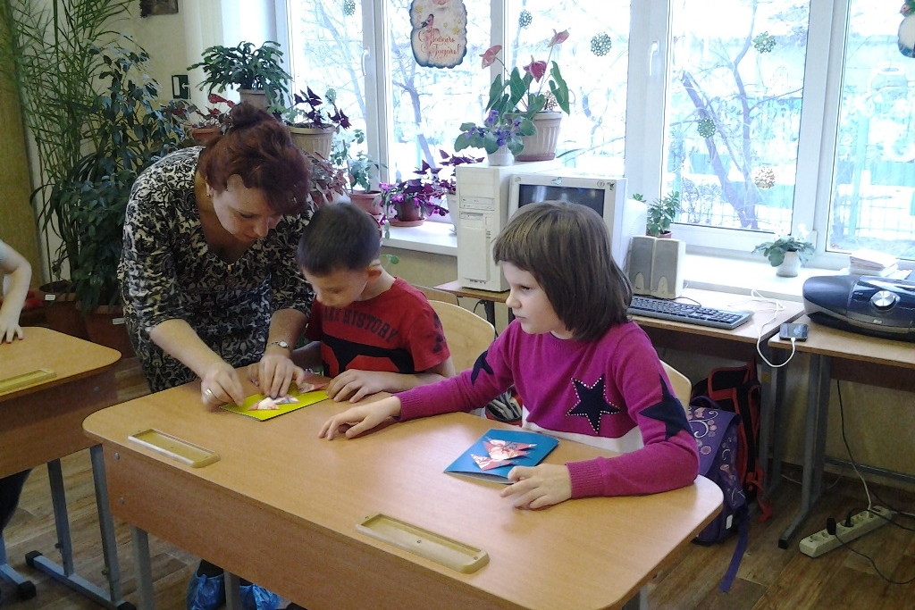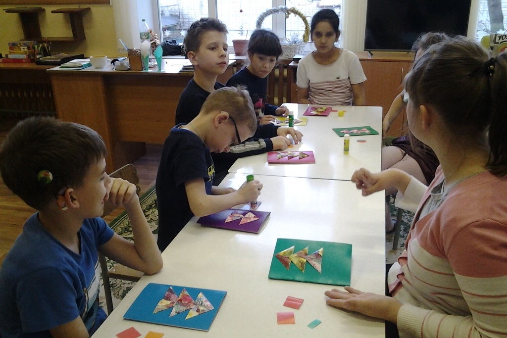 Показывая ребятам, как можно сделать открытку, применили множество рукодельных техник – скрапбукинг, бумагопластику, аппликацию.