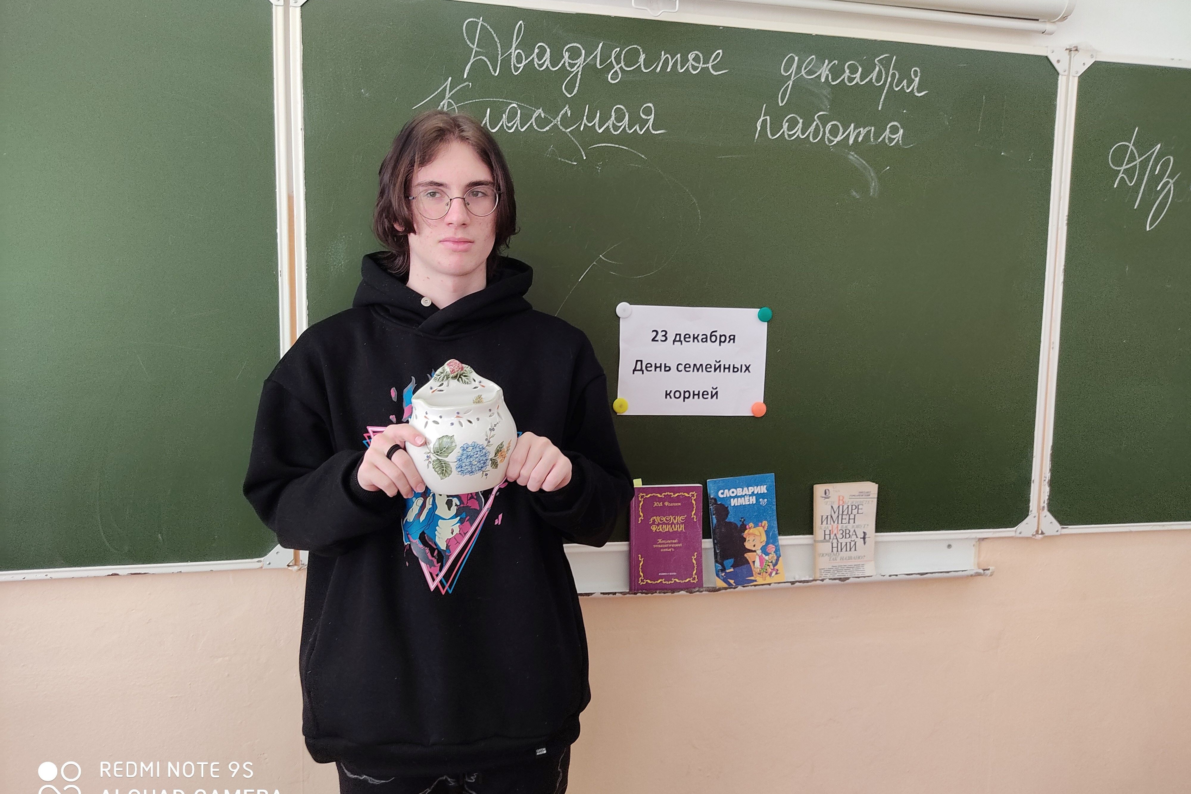 И еще одна страничка организованной встречи — домашние реликвии. Рассказывает Морозов Михаил: — «моя бабушка Екатерина Александровна с 1977 по 1997 работала на фарфоровом заводе в расписном цеху. Бабушки уже нет, но осталось кашпо, которое она сама расписала в ожидании моей мамы, кашпо красивое, ручная работа и конечно память о бабушке. Это самая памятная вещь в нашей семье». В канун Нового года делятся своими историями девятиклассники: Манакова Ратмира рассказала о новогодних игрушках, дошедшие до нового столетия из 1969 г. О маленьком снеговике поведала Царева Марина, это игрушка ее мамы, а мама получила его в свою очередь от Деда Мороза в 1982 г.