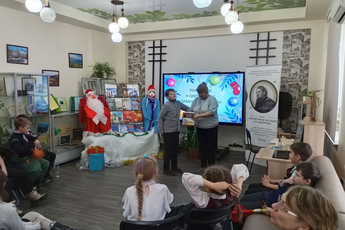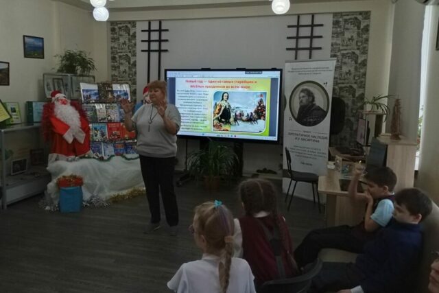 Праздничное мероприятие «Новый год в кругу семьи: традиции и обычаи» прошло в библиотеке имени И.У. Басаргина (ул. Юмашева, 8) для ребят 3 «Б» класса «СОШ № 57» по программе «Юный родовед». Дети охотно участвовали в живом диалоге: уютно устроились на диванчиках и стульях, и с удовольствием окунулись в атмосферу праздника.