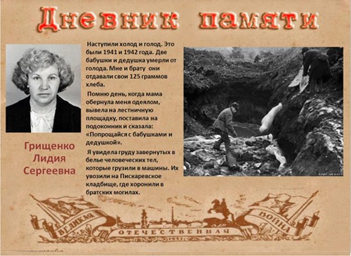 Лидия Сергеевна Грищенко, член Городской общественной организации «Жители блокадного Ленинграда». В 1941 году Лидии Сергеевне было всего 7 лет. Глазами повзрослевшего ребёнка она оставила свои воспоминания.