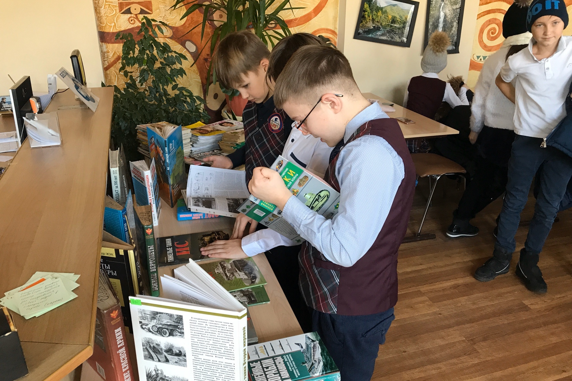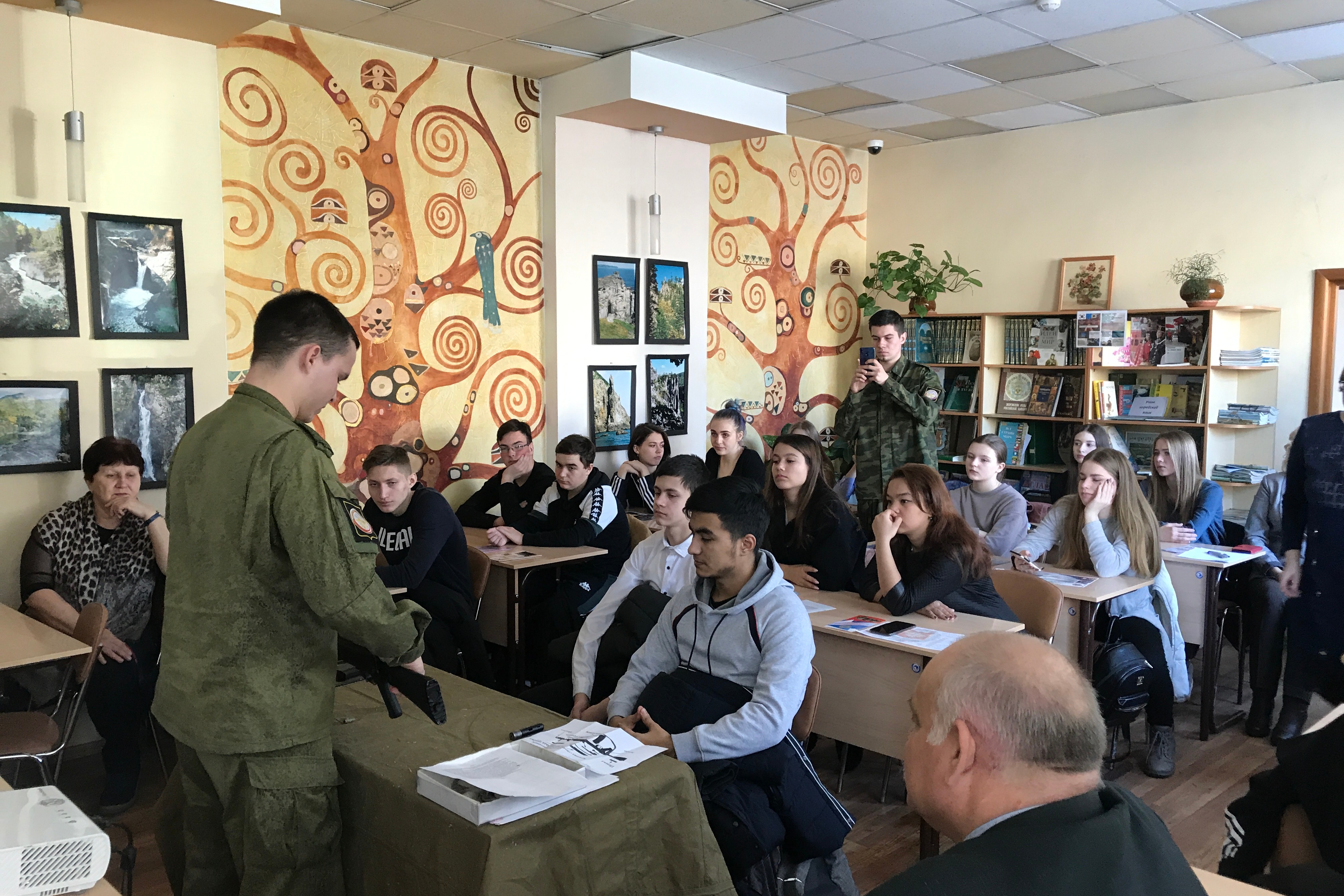 Также в библиотеке им. Чехова прошла встреча будущих защитников Отечества с представителями военного комиссариата. Начальник отдела подготовки граждан к военной службе военного комиссариата Приморского края Сепик Сергей Викторович рассказал о высших военных учебных заведениях России и Приморья. В процессе беседы он отметил, что получить военное образование – осознанный выбор жизненного пути. Ребята внимательно и с огромной заинтересованностью просматривали видеоролики о морских пехотинцах и десантниках, о «юнармии в действии», о службе в горных подразделениях и арктических войсках. Особый восторг вызвали представители ДОСААФа Данил Лаптев и Максим Сизиков, показавшие, как быстро и правильно нужно собрать и разобрать автомат АК-47.
