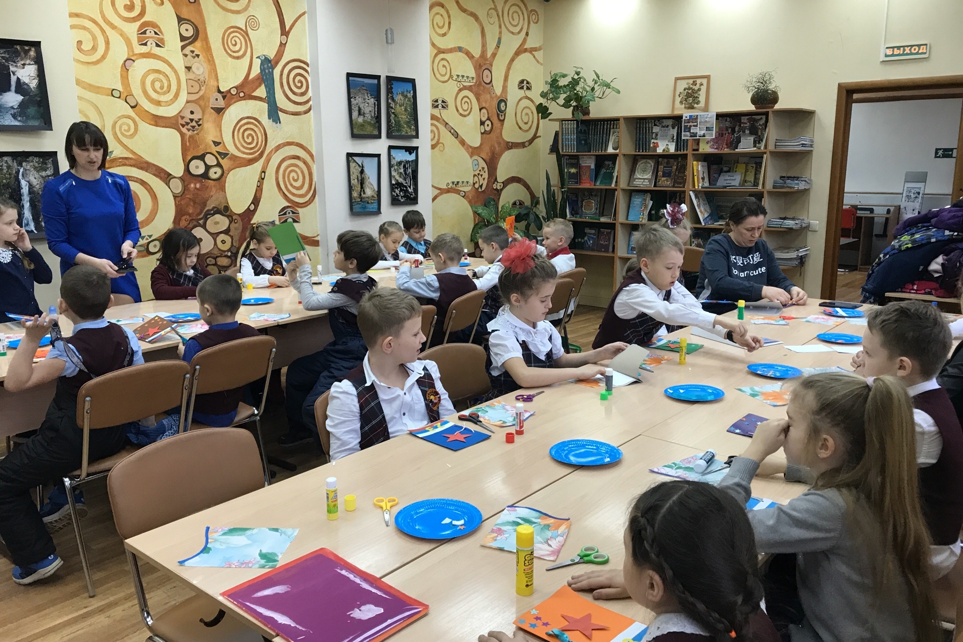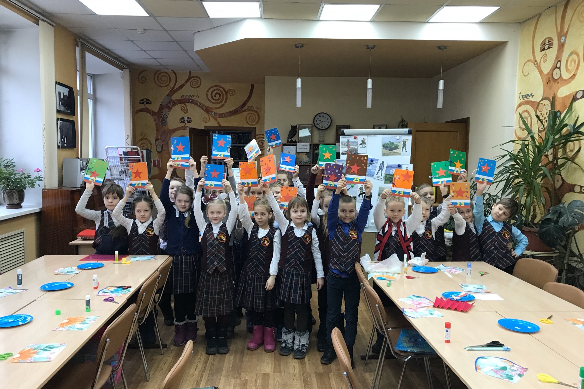 Для самых юных читателей был подготовлен творческий мастер-класс «Подарок для папы». Ученики 1 класса Начальной общеобразовательной школы №10 в Чеховке были впервые. Для первоклассников была проведена беседа о знаменательном для нашей страны празднике и о российской армии. Ребята поиграли в игру «Наша армия родная», где надо было соотнести карточки с солдатами в разной форме с родами войск России. Затем в подарок для любимых пап они сделали блокнот, на обложке которого была аппликация в виде российского флага и красной звезды.