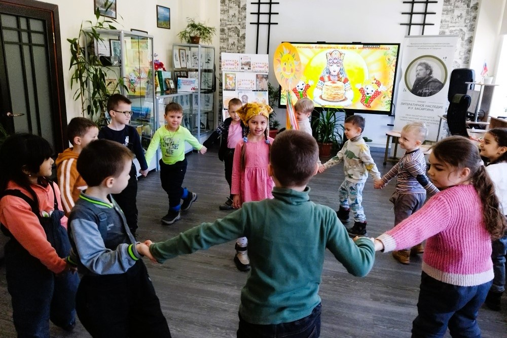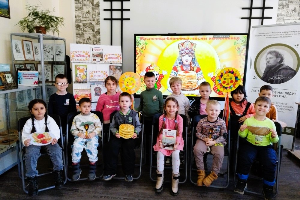 В библиотеке им. И. У. Басаргина для детей МБДОУ «Центр развития ребенка-детский сад № 145 г. Владивостока» была организована праздничная карусель «Масленица на Руси: история и традиции». Ребята познакомились с историей и традициями празднования Масленицы. Так же дети узнали откуда пошла поговорка «Первый блин-комом». На книжной выставке «Масленица на страницах книг» ребята увидели книги об истории праздника и традиционных обрядах, пословицы, поговорки, песни, загадки, стихи и поздравления. Разделившись на команды «Лепешки» и «Блины» дети пели частушки, участвовали в соревновательной игре «Собери лучики солнца».