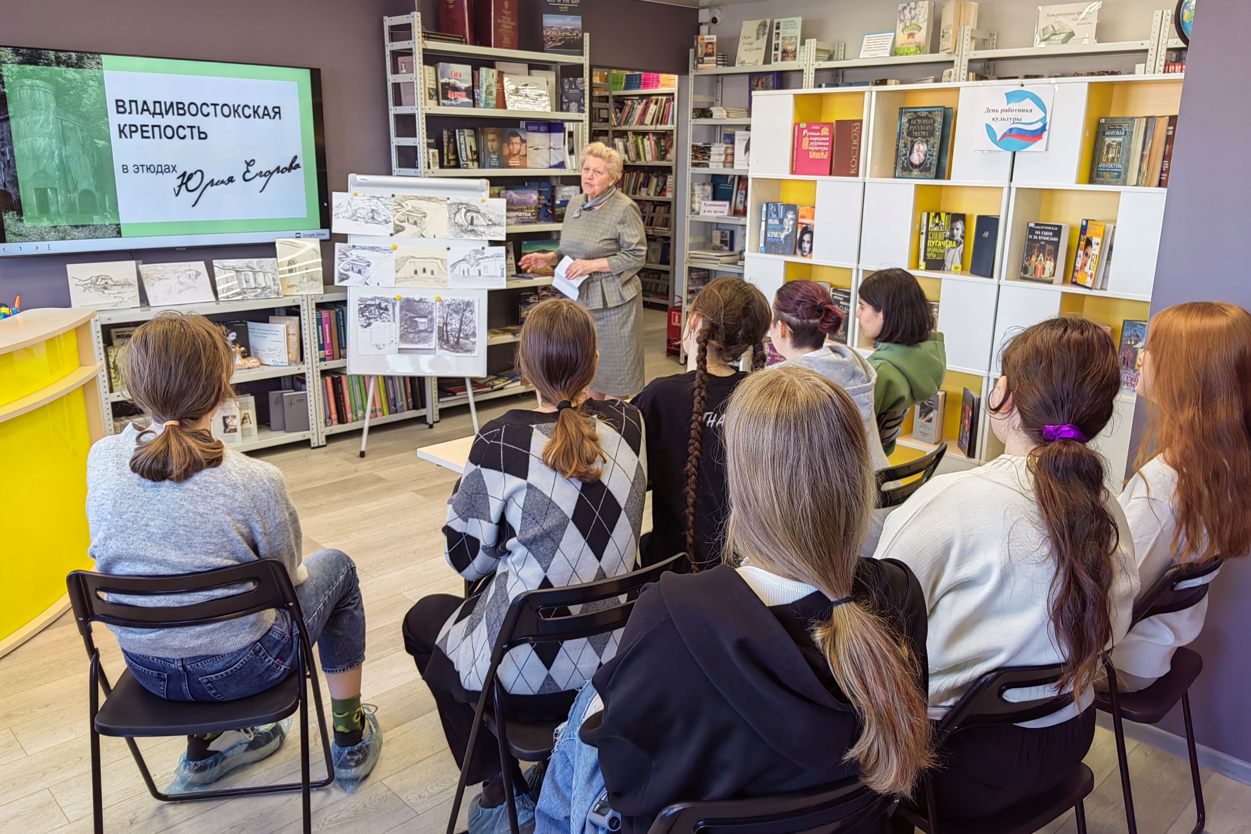 В преддверии Дня работника культуры в подарок для библиотеки № 21 художник и читатель библиотеки Юрий Егоров предоставил свои картины. Среди них много изображений исторического объекта города – Владивостокской крепости. Это памятник культурного наследия федерального назначения, взят под охрану государства, а 2024 год объявлен «Годом Владивостокской Крепости».