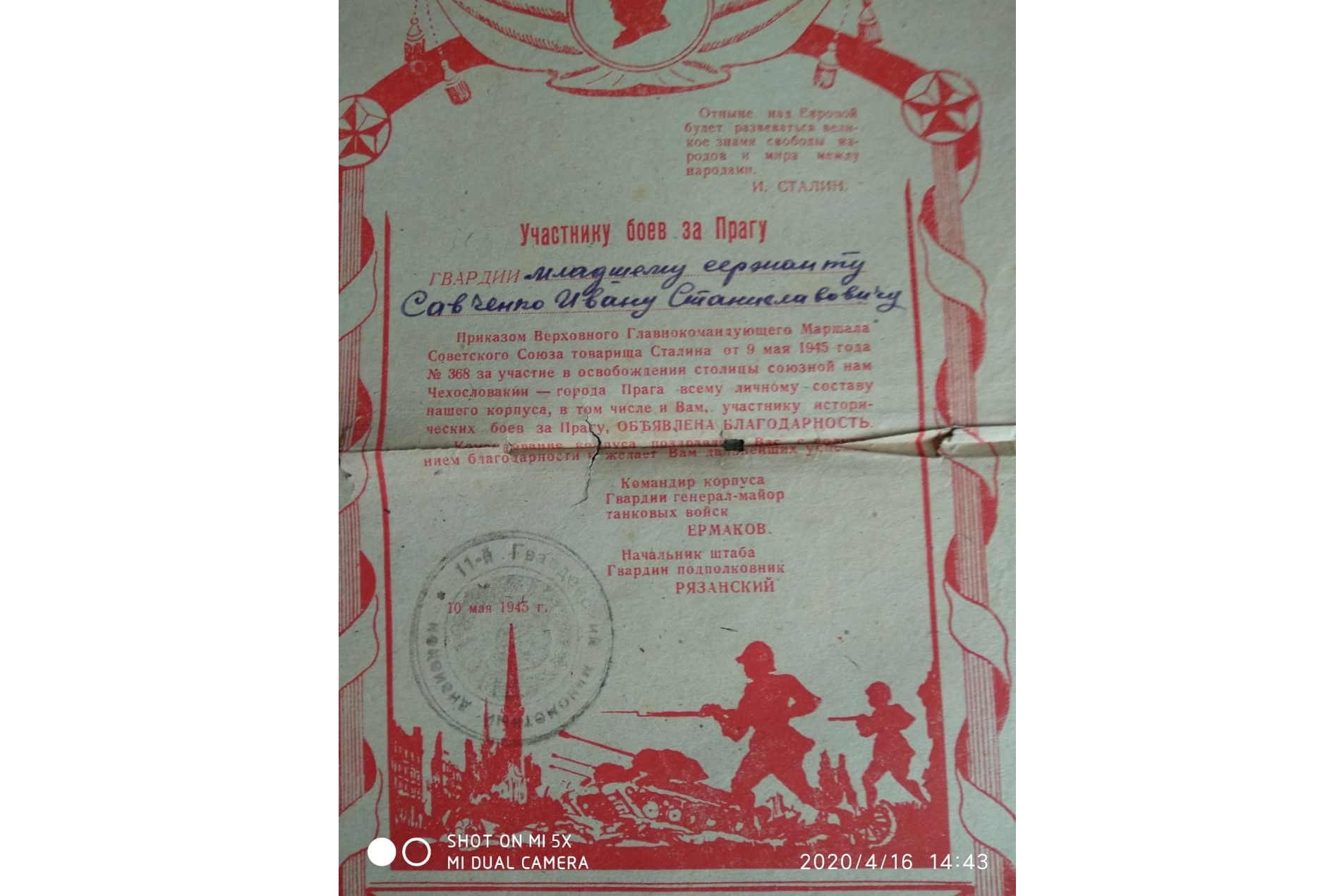 День победы Иван Савченко встретил в шахтёрском городке Кладно, где довелось принять участие в разгроме большой группы немецких вояк. Это было последнее сражение на полях битв с фашистской Германией.
